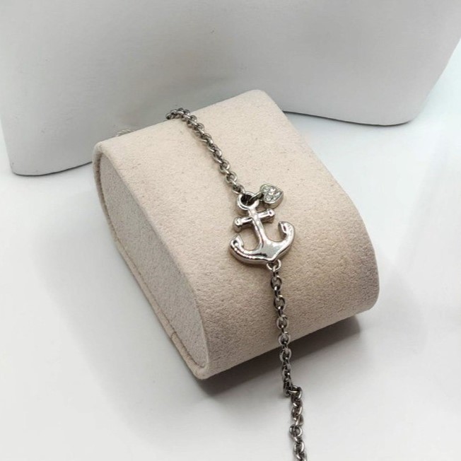 Bracciale in acciaio 316L ipoallergenico con ancora centrale e un cuoricino zirconato, chiusura a moschettone