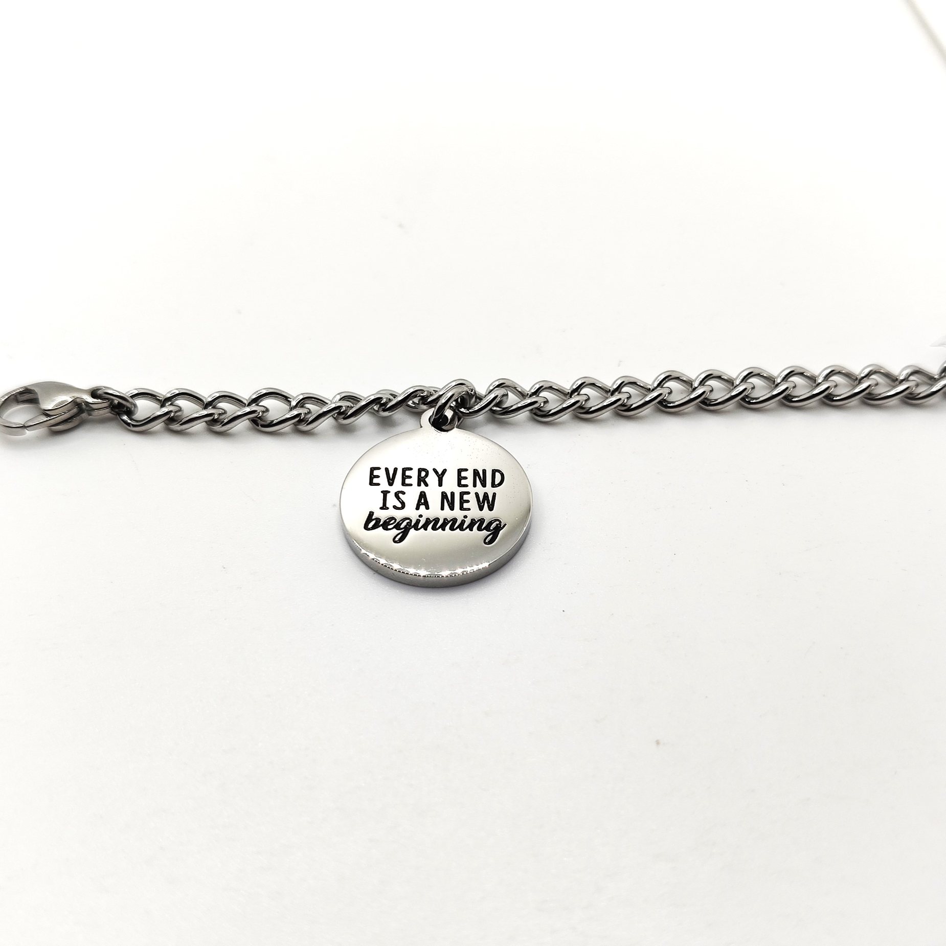 Bracciale della collezione play together in acciaio 316L ipoallergenico con scritta “every end is a new beginning” da abbinare con un altra metà bracciale con diverso messaggio o simbolo! Divertiti a scegliere quello che più ti rappresenta. Chiusura a moschettone regolabile.