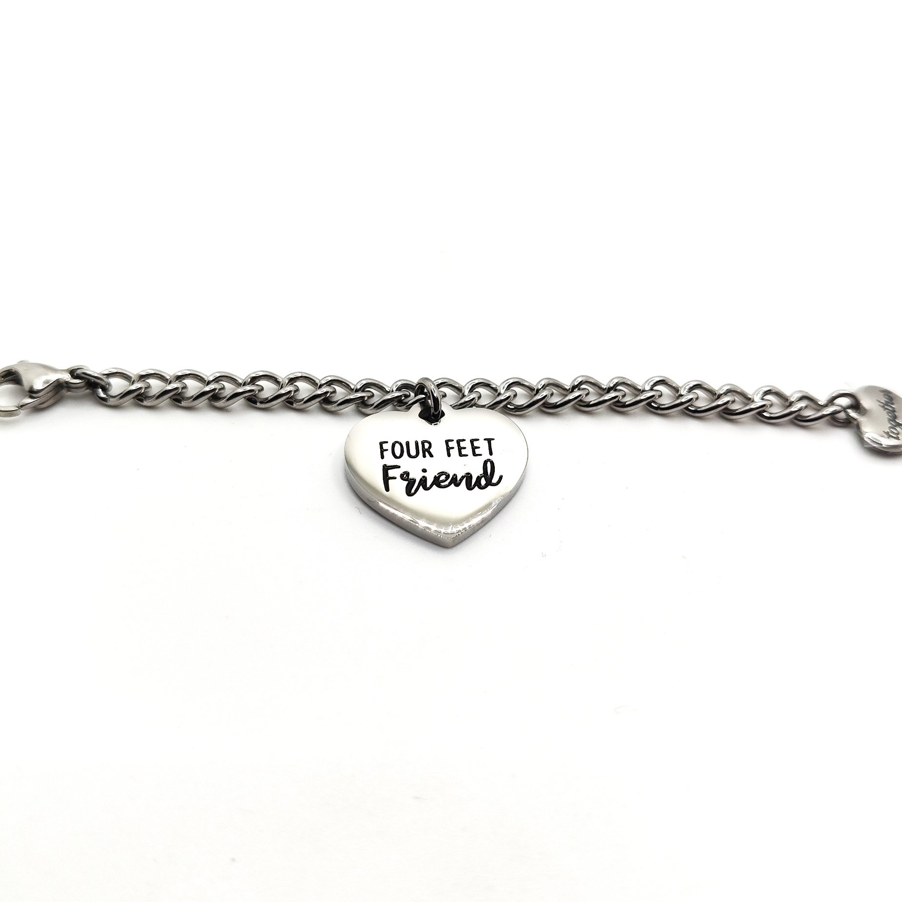 Bracciale della collezione play together in acciaio 316L ipoallergenico con scritta “FOUR FEET FRIEND” da abbinare con un altra metà bracciale con diverso messaggio o simbolo! Divertiti a scegliere quello che più ti rappresenta. Chiusura a moschettone regolabile.