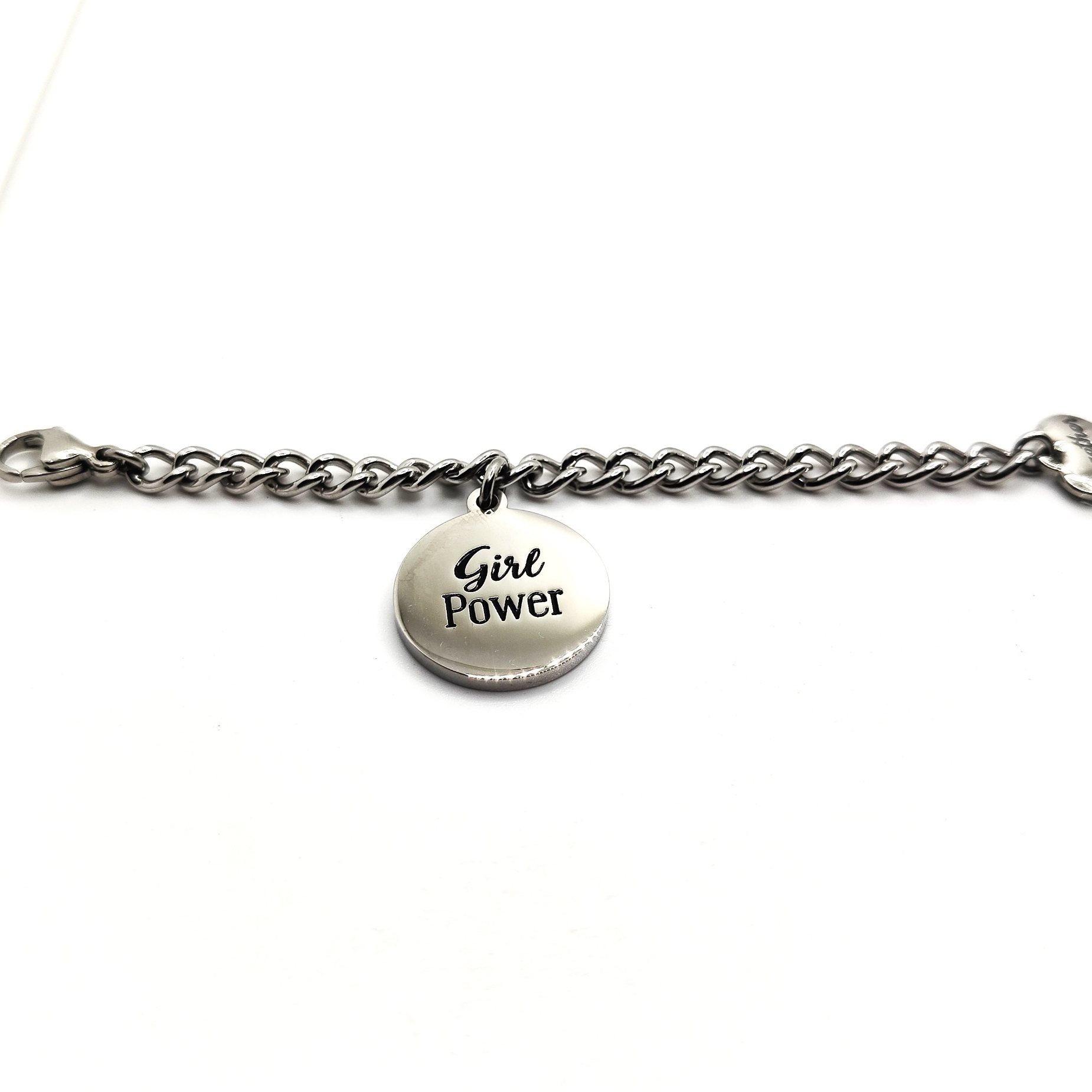 Bracciale della collezione play together in acciaio 316L ipoallergenico con scritta “GIRL POWER” da abbinare con un altra metà bracciale con diverso messaggio o simbolo! Divertiti a scegliere quello che più ti rappresenta. Chiusura a moschettone regolabile.