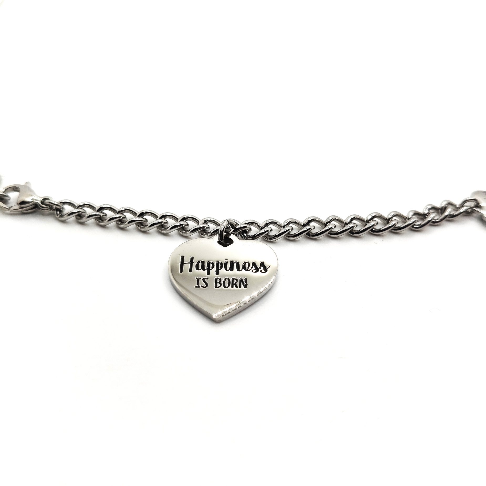 Bracciale della collezione play together in acciaio 316L ipoallergenico con scritta “HAPPINESS IS BORN” da abbinare con un altra metà bracciale con diverso messaggio o simbolo! Divertiti a scegliere quello che più ti rappresenta. Chiusura a moschettone regolabile.