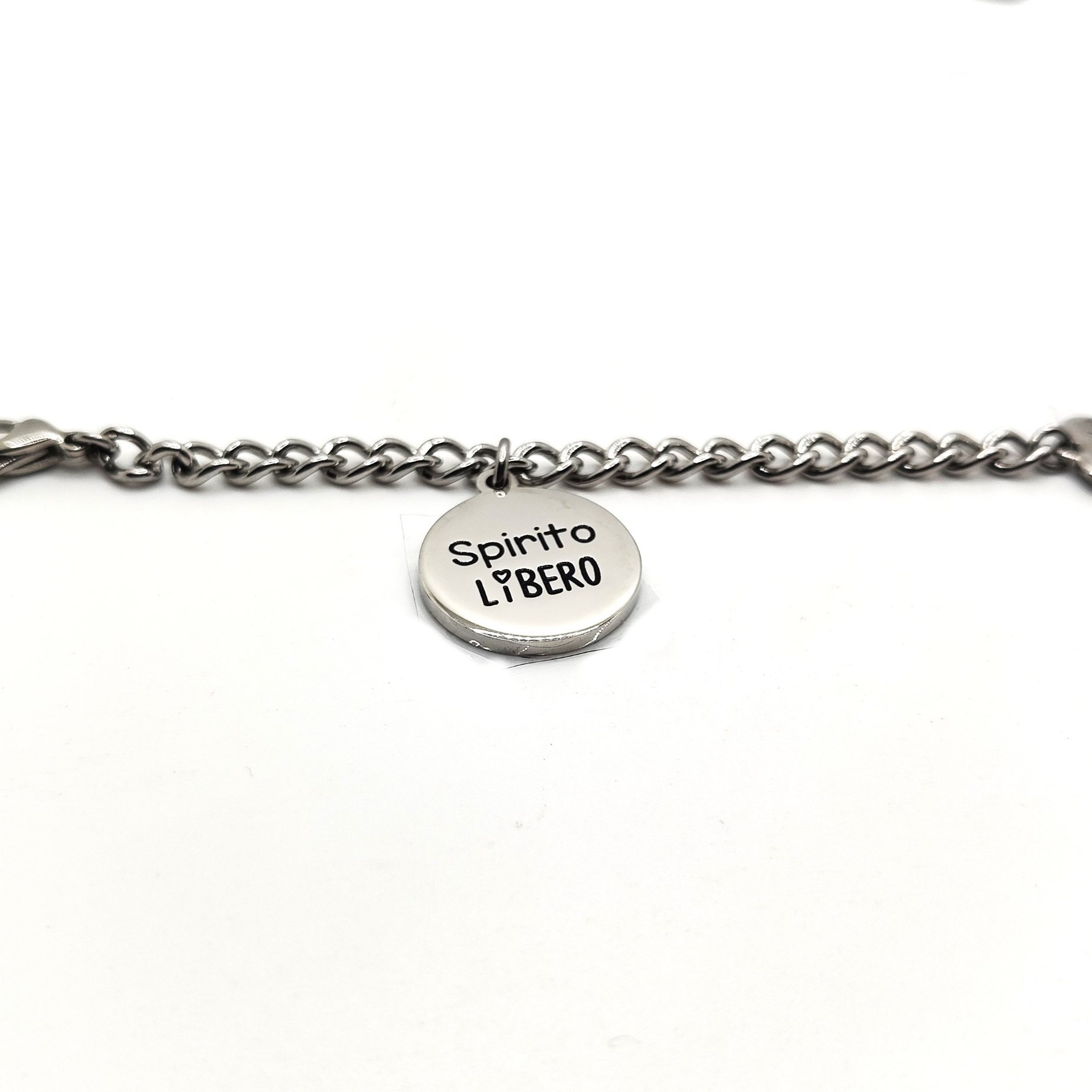 Bracciale della collezione play together in acciaio 316L ipoallergenico con scritta “SPIRITO LIBERO” da abbinare con un altra metà bracciale con diverso messaggio o simbolo! Divertiti a scegliere quello che più ti rappresenta. Chiusura a moschettone regolabile.