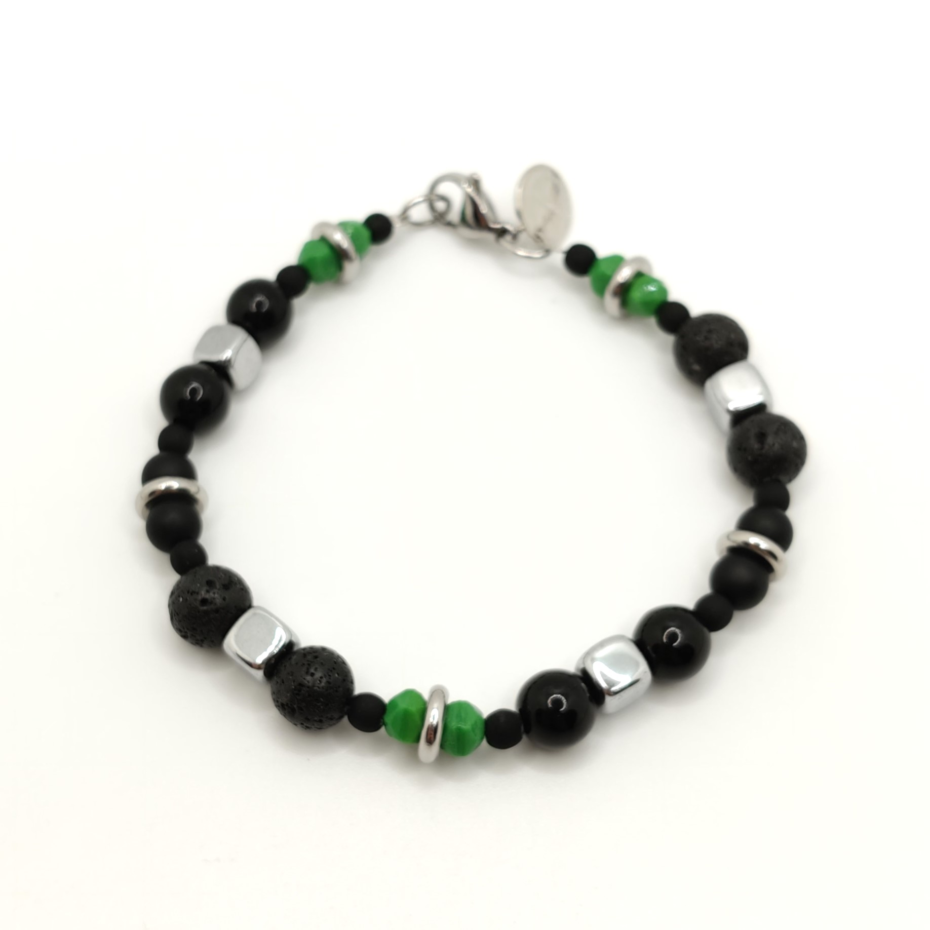 Bracciale da uomo semirigido in pietre verde, laviche, nere e pepite di acciaio con chiusura a moschettone possibilità di essere regolato