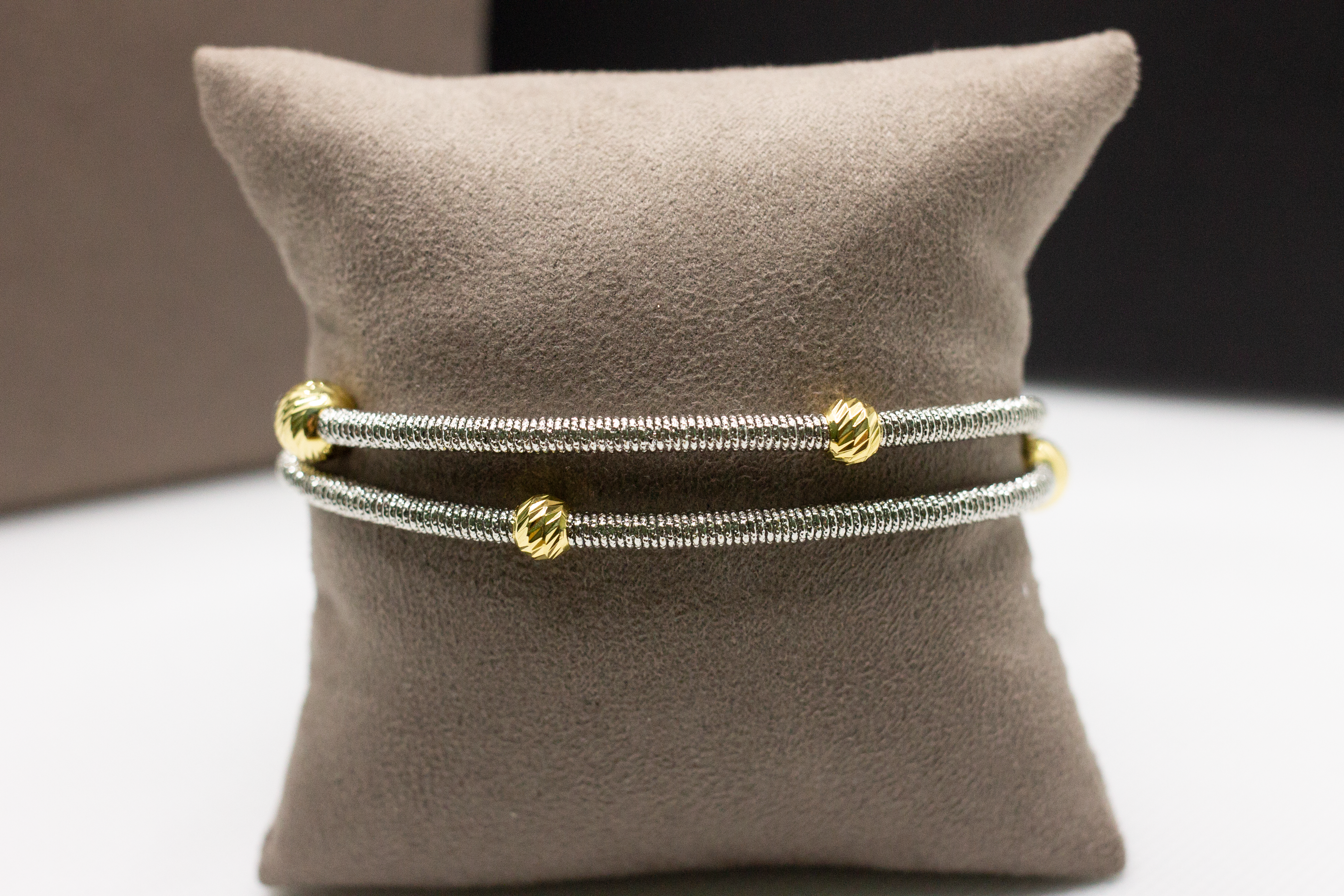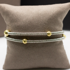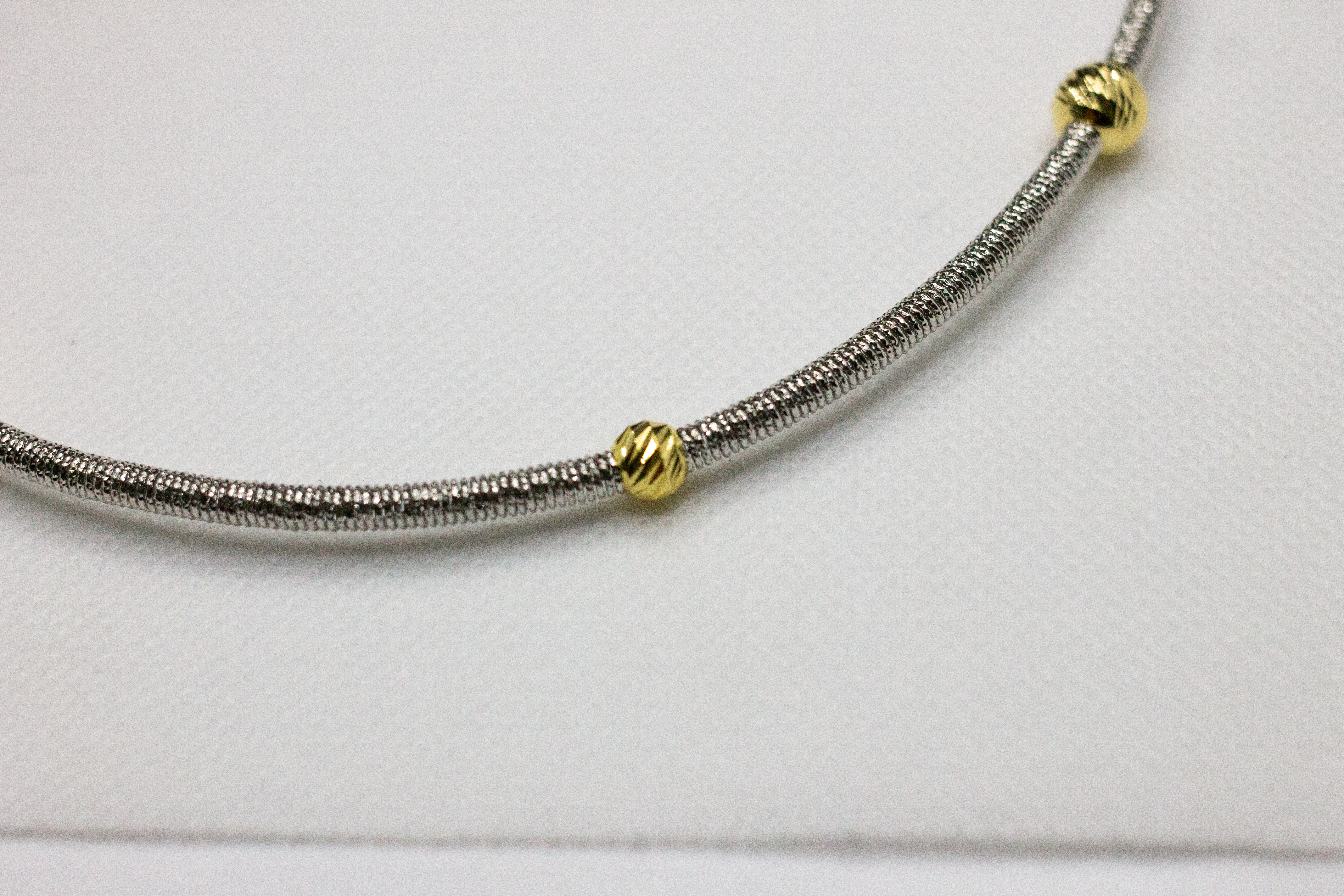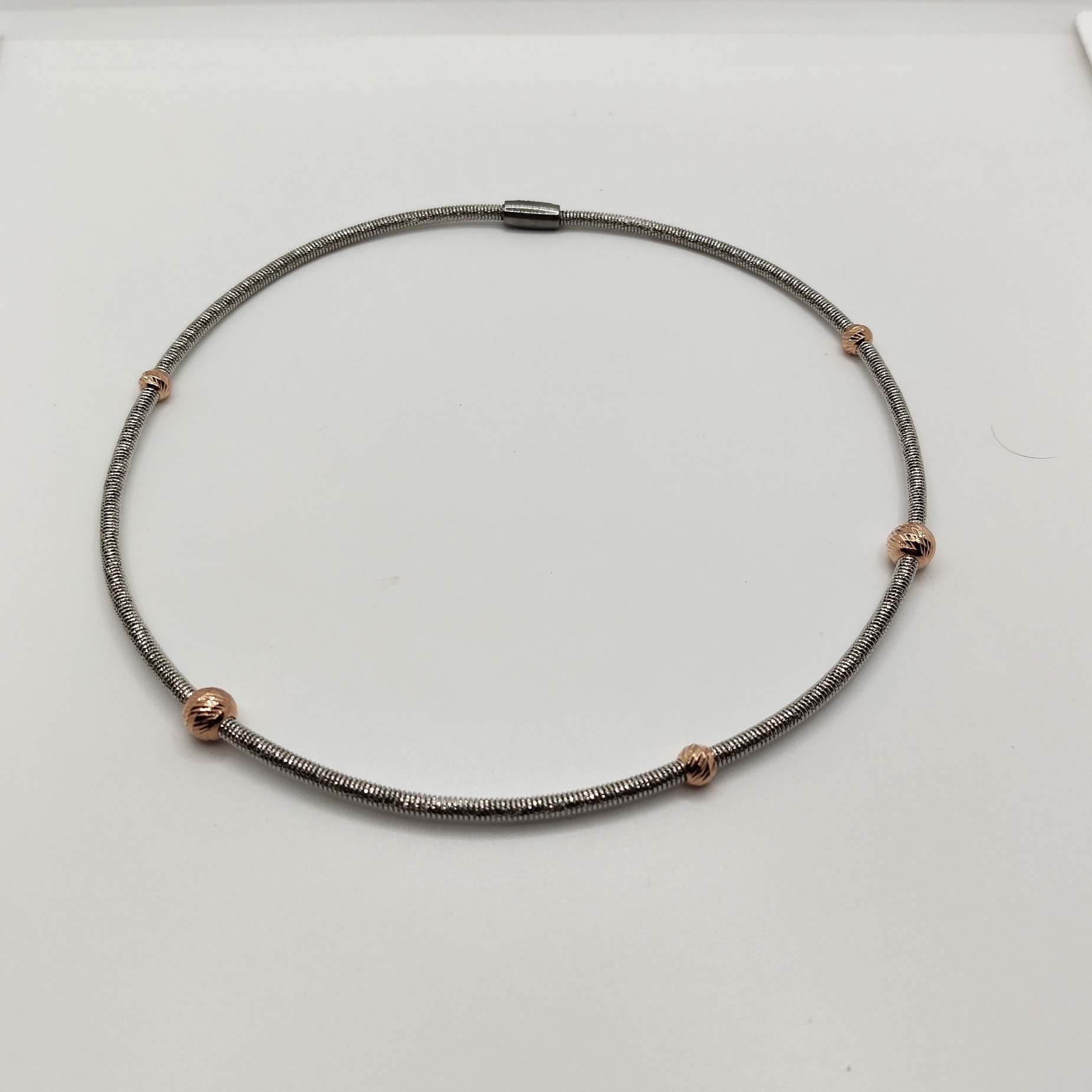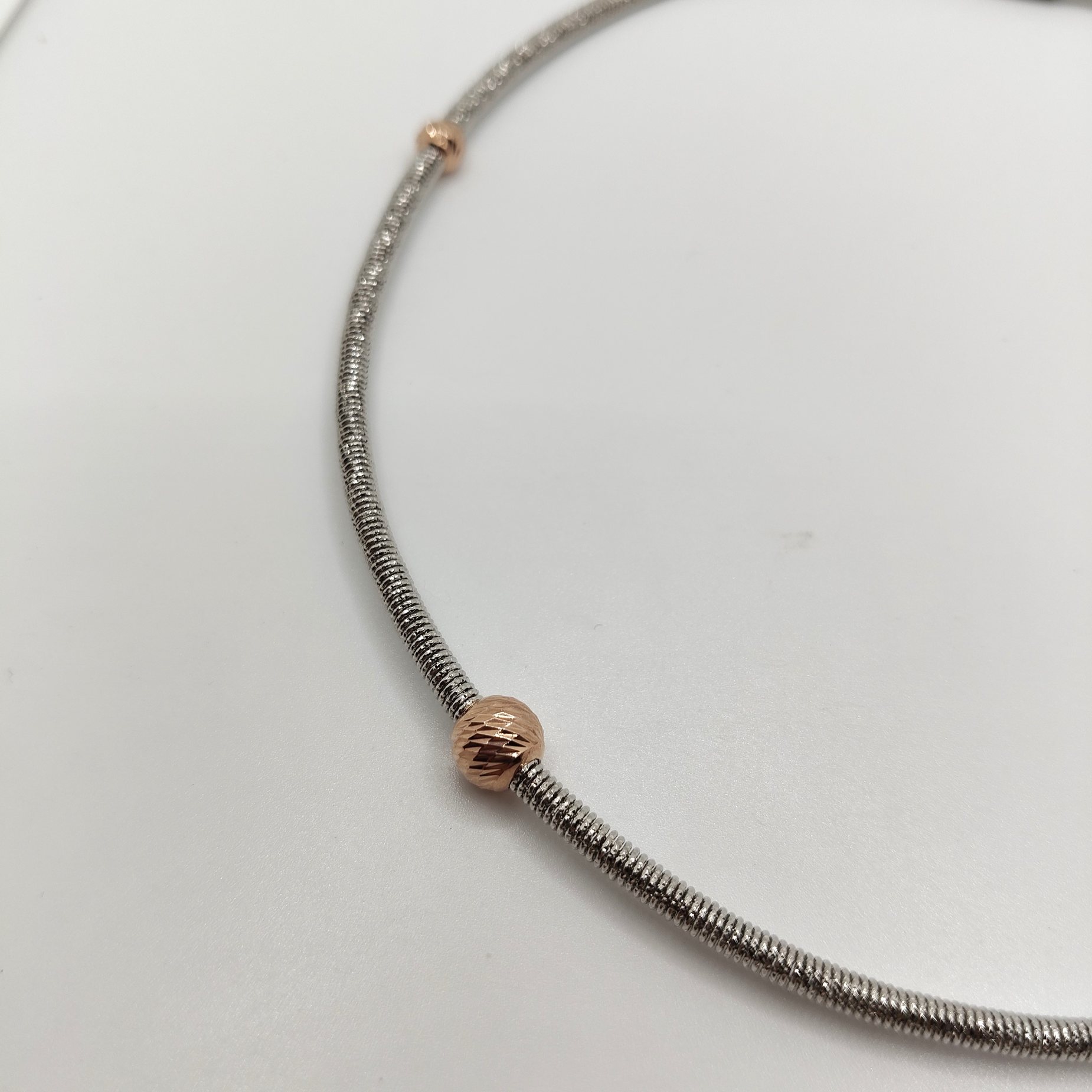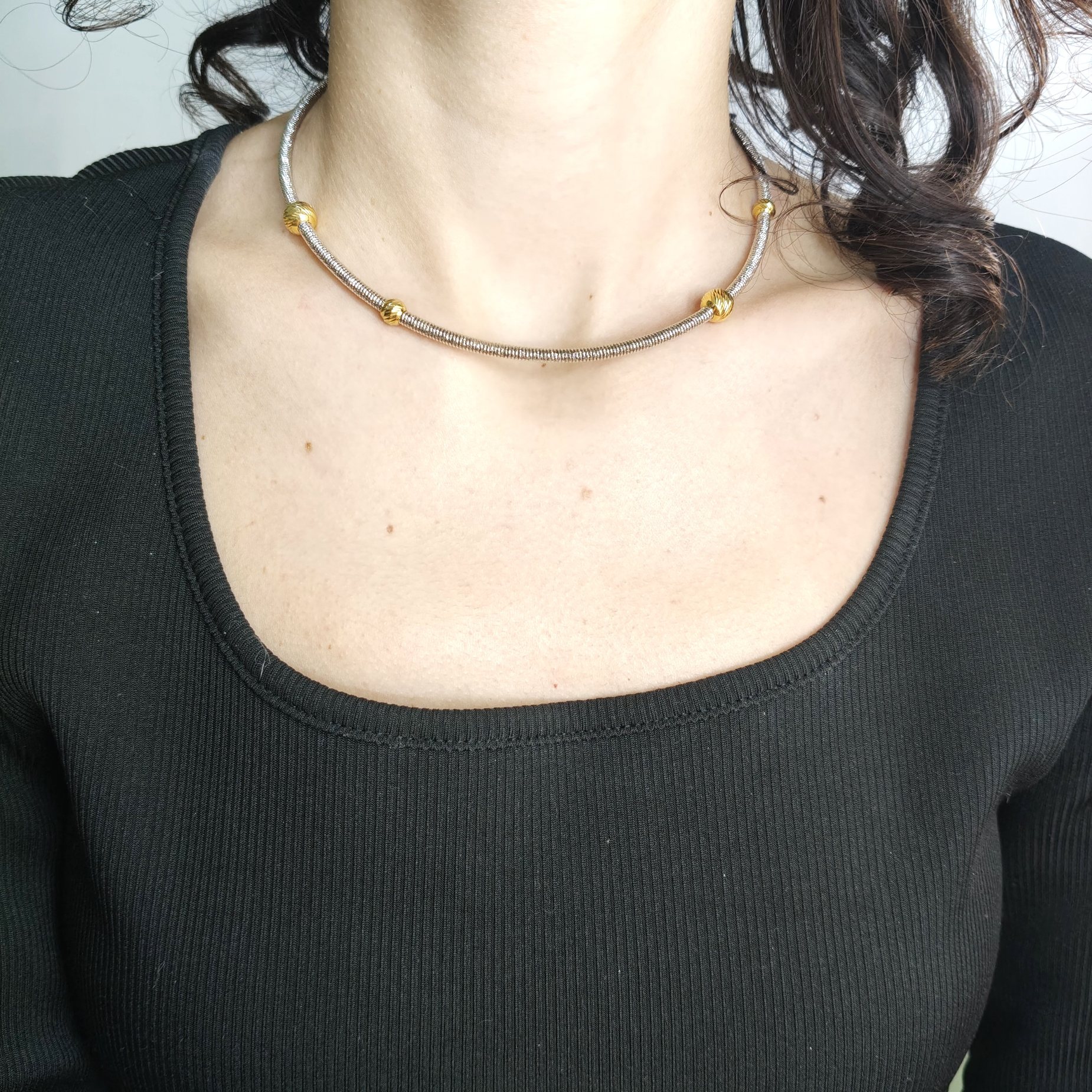 Collana girocollo in bronzo rodiato argento e sfere placcate in oro lavorato a mano made in Italy. Possibile indossarla anche come bracciale a doppio filo.