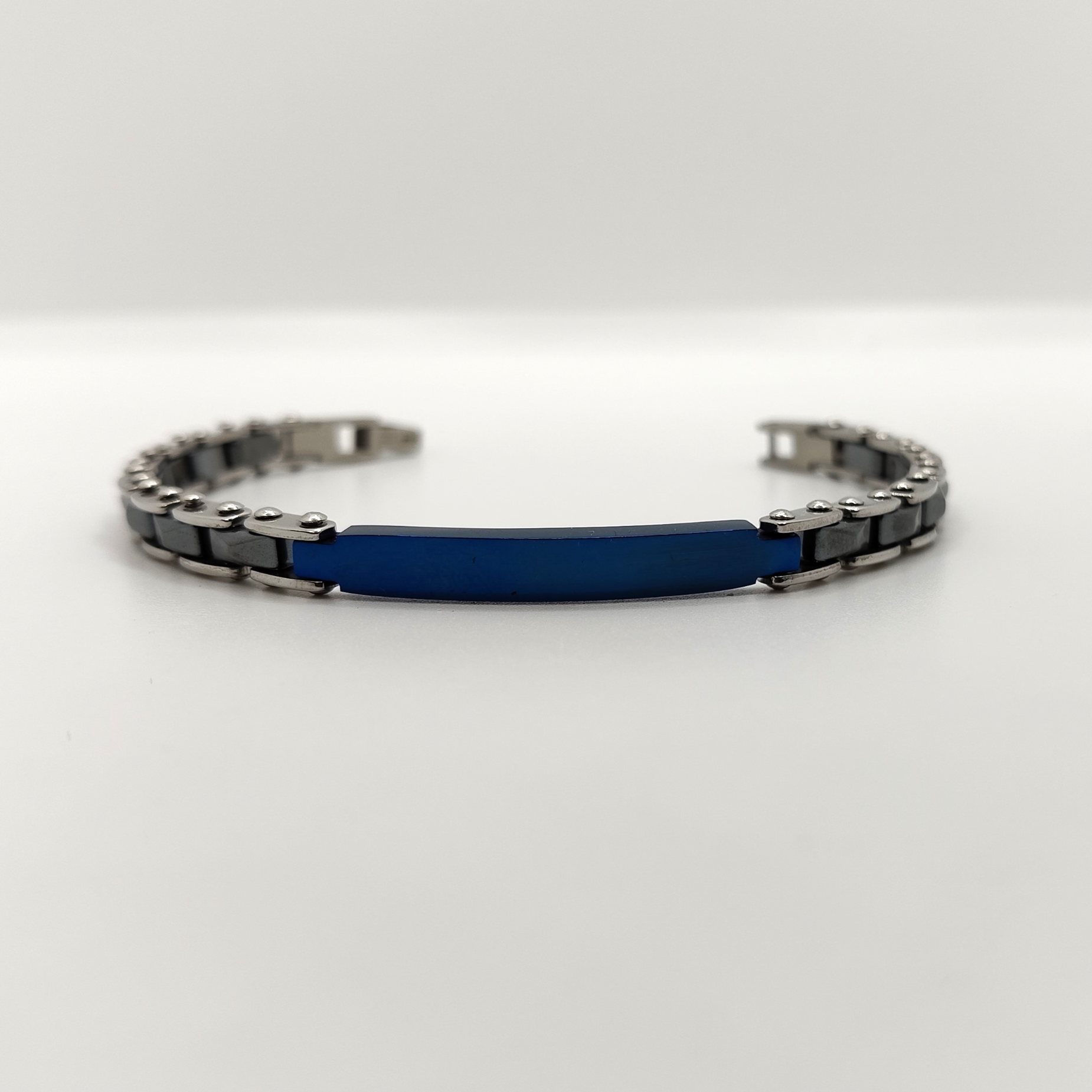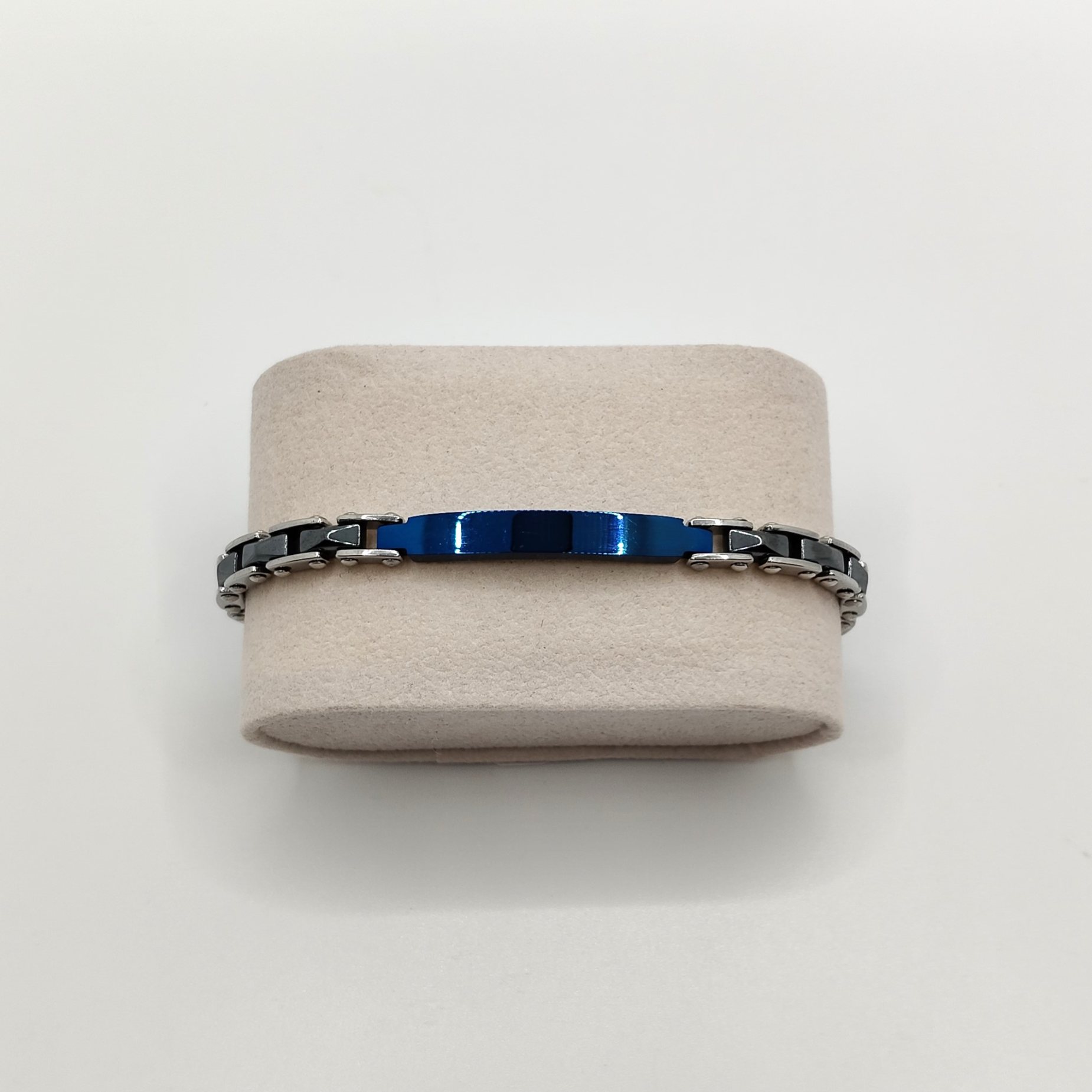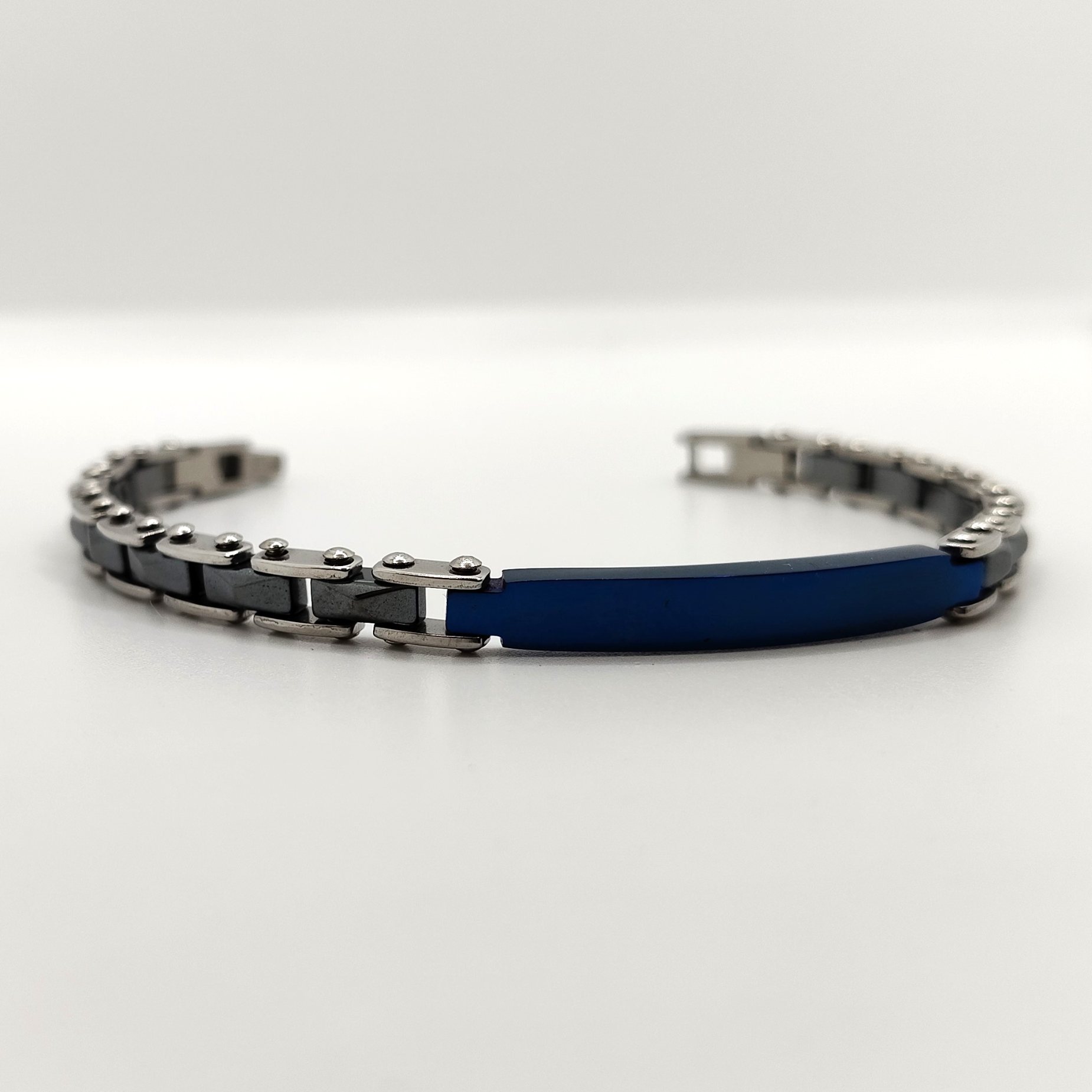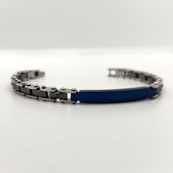 Bracciale da uomo in acciaio e ceramica grigio antracite con targa in acciaio blu nella parte superiore.