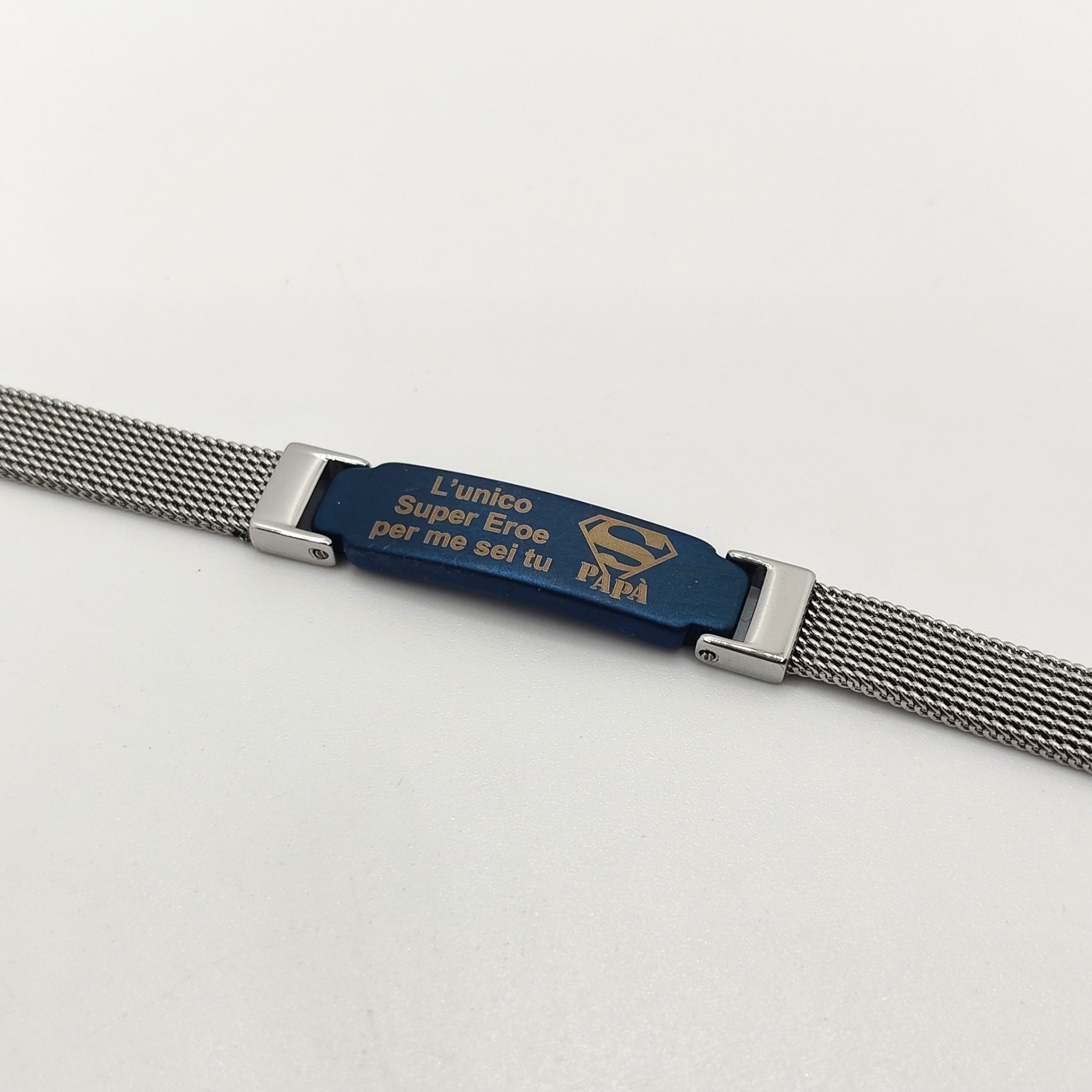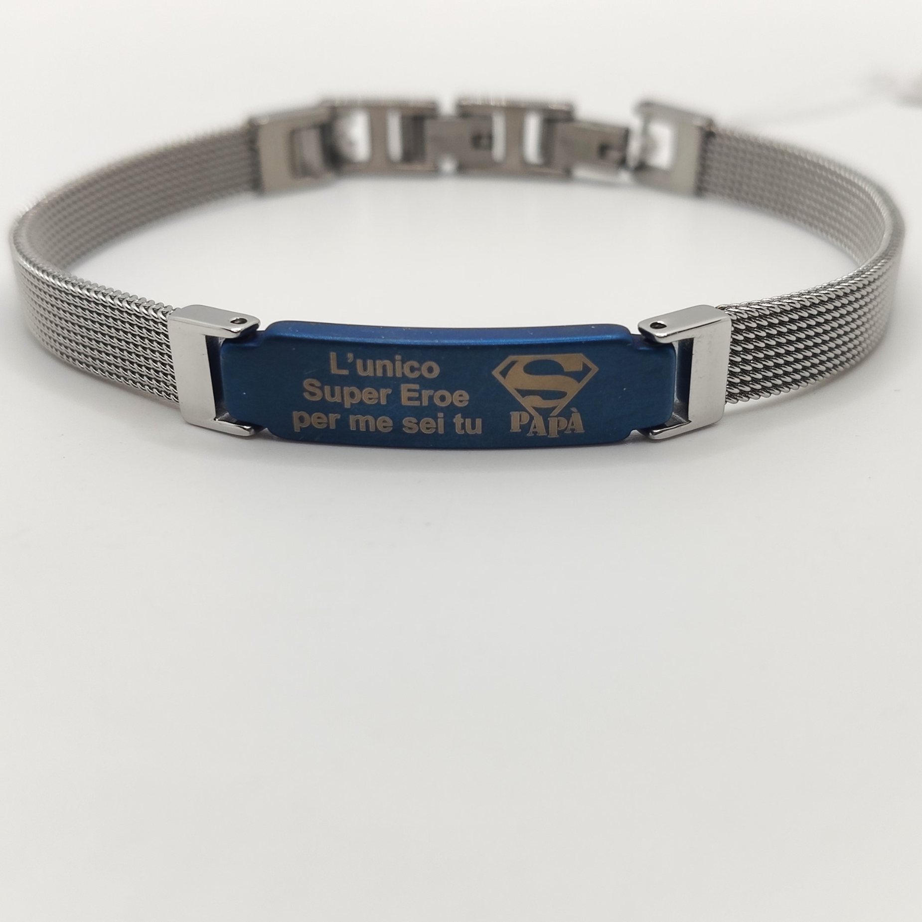 Bracciale da uomo in acciaio semirigido, maglia Milano e targa centrale blu con scritto “L’unico super eroe per me sei tu papà” regolabile grazie alla doppia chiusura