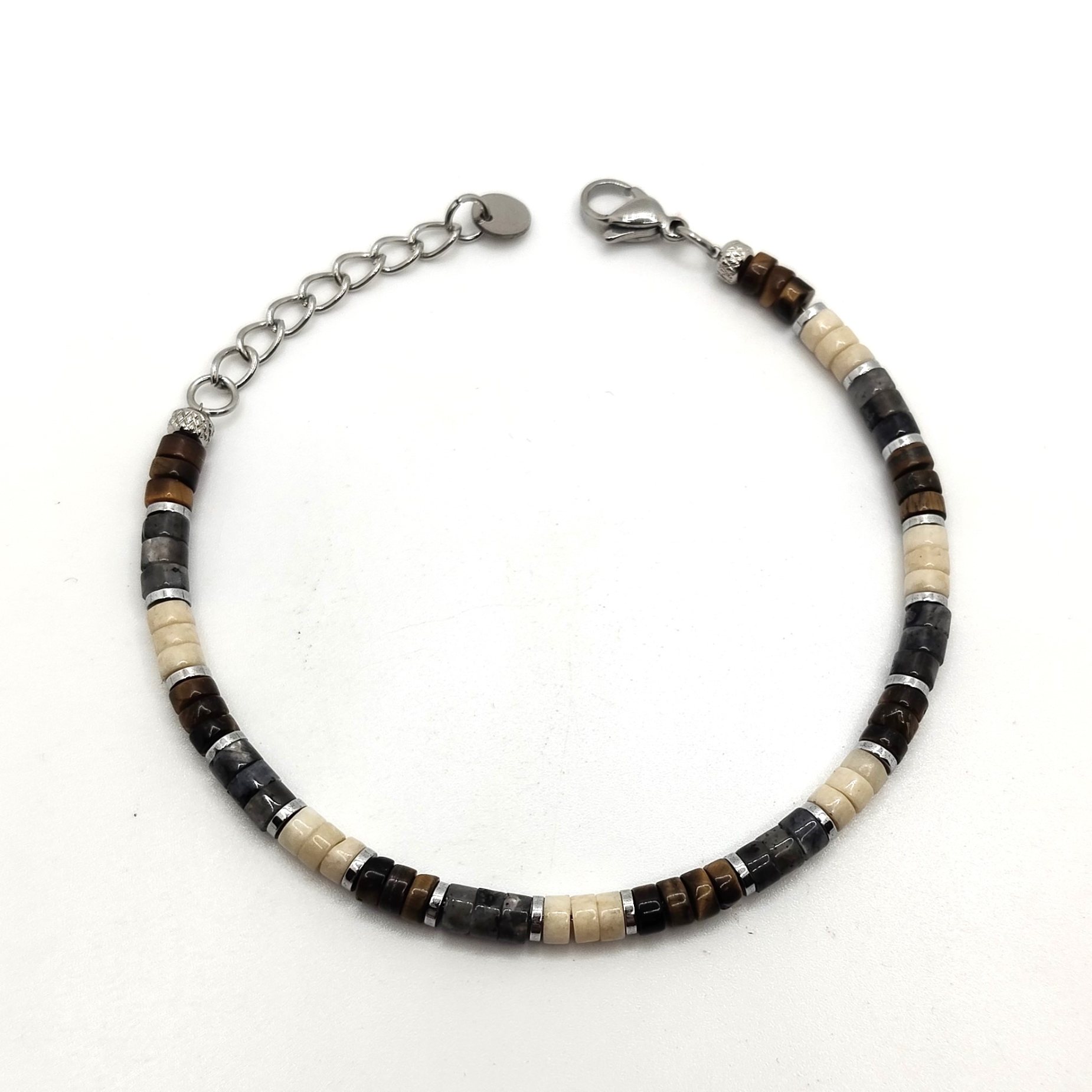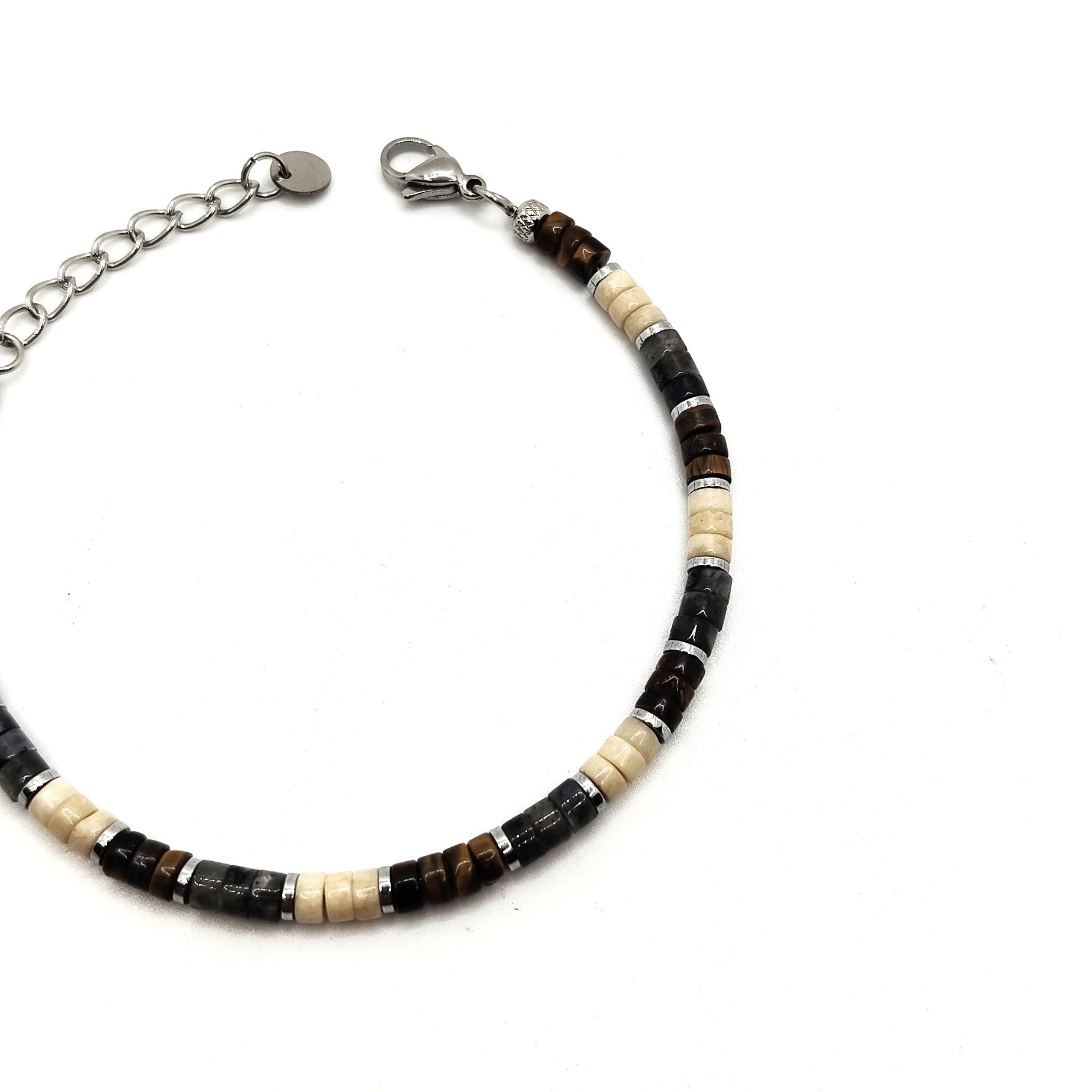 Bracciale da uomo con pepite in acciaio con pietre marroni grigio e beige effetto marmorizzato. La lunghezza è variabile grazie alla prolunga facilmente regolabile.