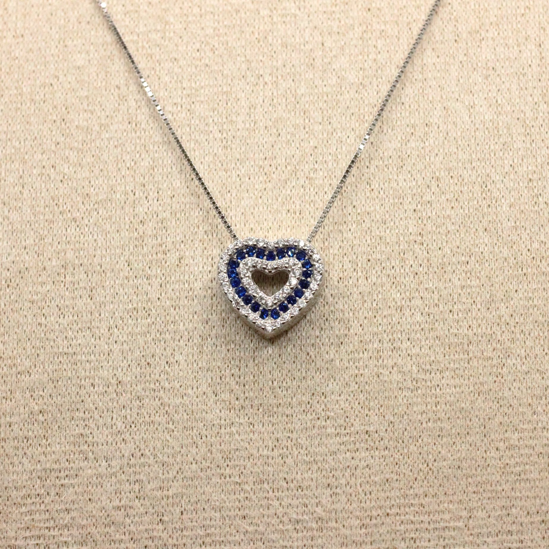 Collana a forma di cuore in argento 925 con zirconi bianchi e blu, chiusura a moschettone