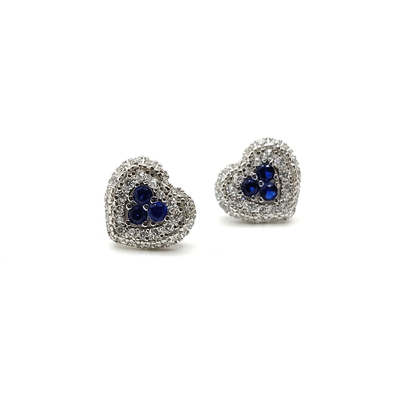 Orecchini a forma di cuore zirconi bianco e blu in argento 925 placcato oro smaltati .