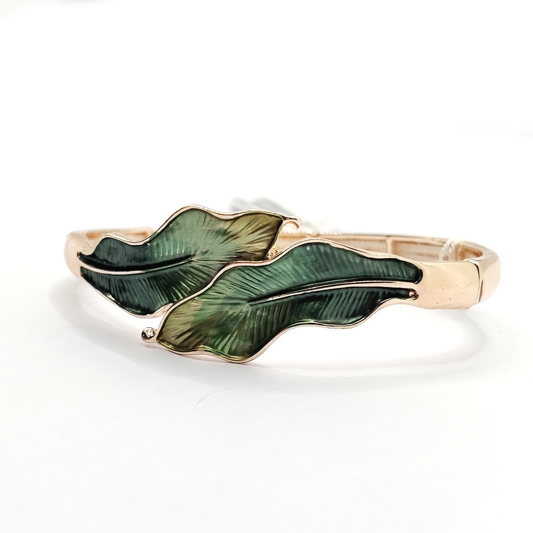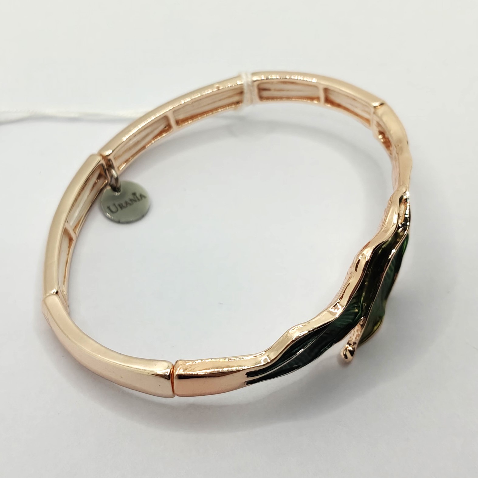 Bracciale urania collezione armonia in ottone placcato oro rosa con dettagli a foglia di diverso colore verde chiaro/scuro, chiusura a molla