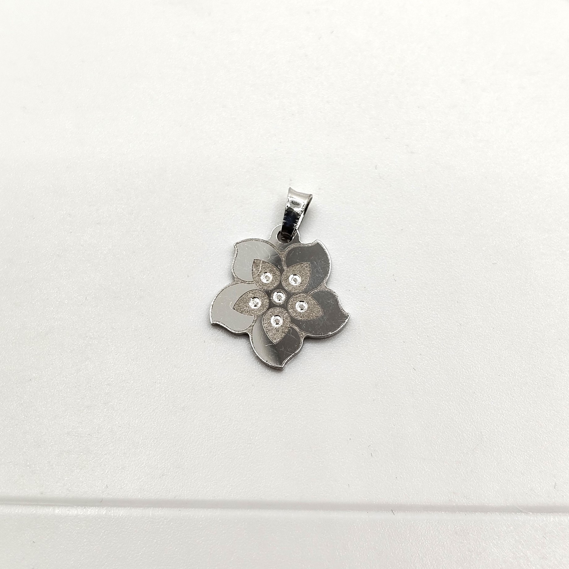 Pendente a forma di fiore realizzato in argento 925 lucido e satinato con zirconi. Il pendente viene venduto senza catenina; è possibile acquistarla nell’apposita sezione.