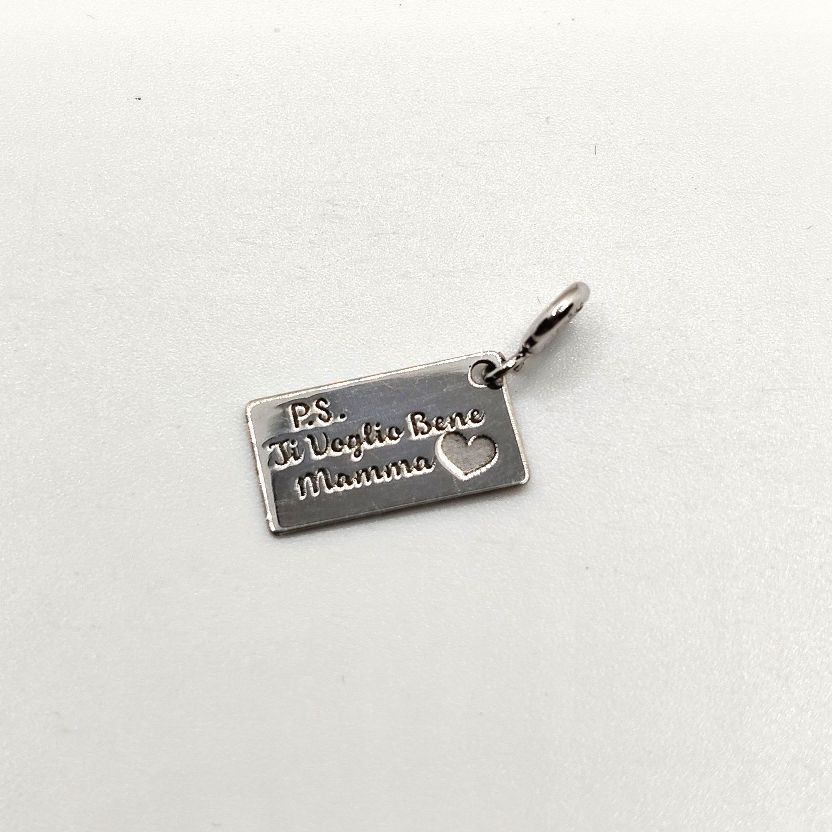 Pendente a forma di targhetta con inciso “P.S. ti voglio bene mamma” realizzato in argento 925 con chiusura a moschettone che può essere agganciato sotto qualsiasi maglia di bracciale o collana. Il pendente viene venduto senza catenina; è possibile acquistarla nell’apposita sezione.