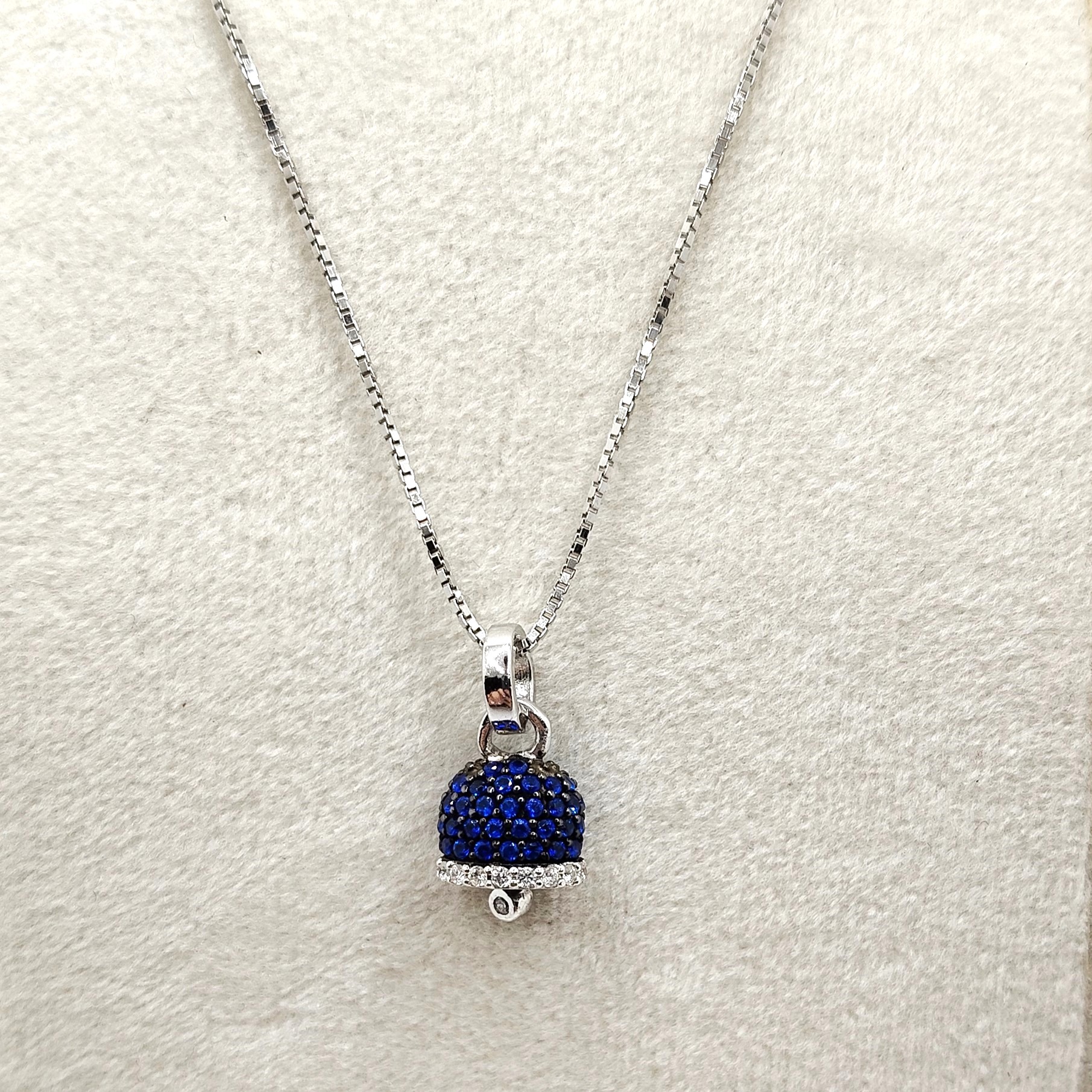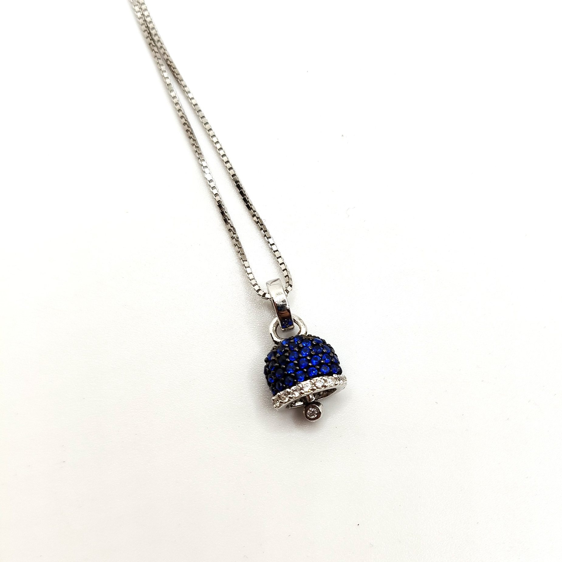 Collana con campanella modello capri in argento 925. Il centrale si presenta come una campanella in argento brunito intarsiata di zirconi blu e bianchi. La lunghezza della catenina varia a seconda della richiesta in genere è presenta una dalla lunghezza classica di 45 cm salvo diversa comunicazione in fase d’acquisto.