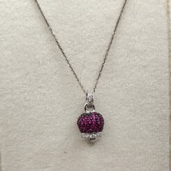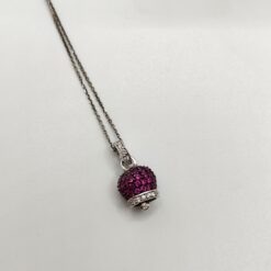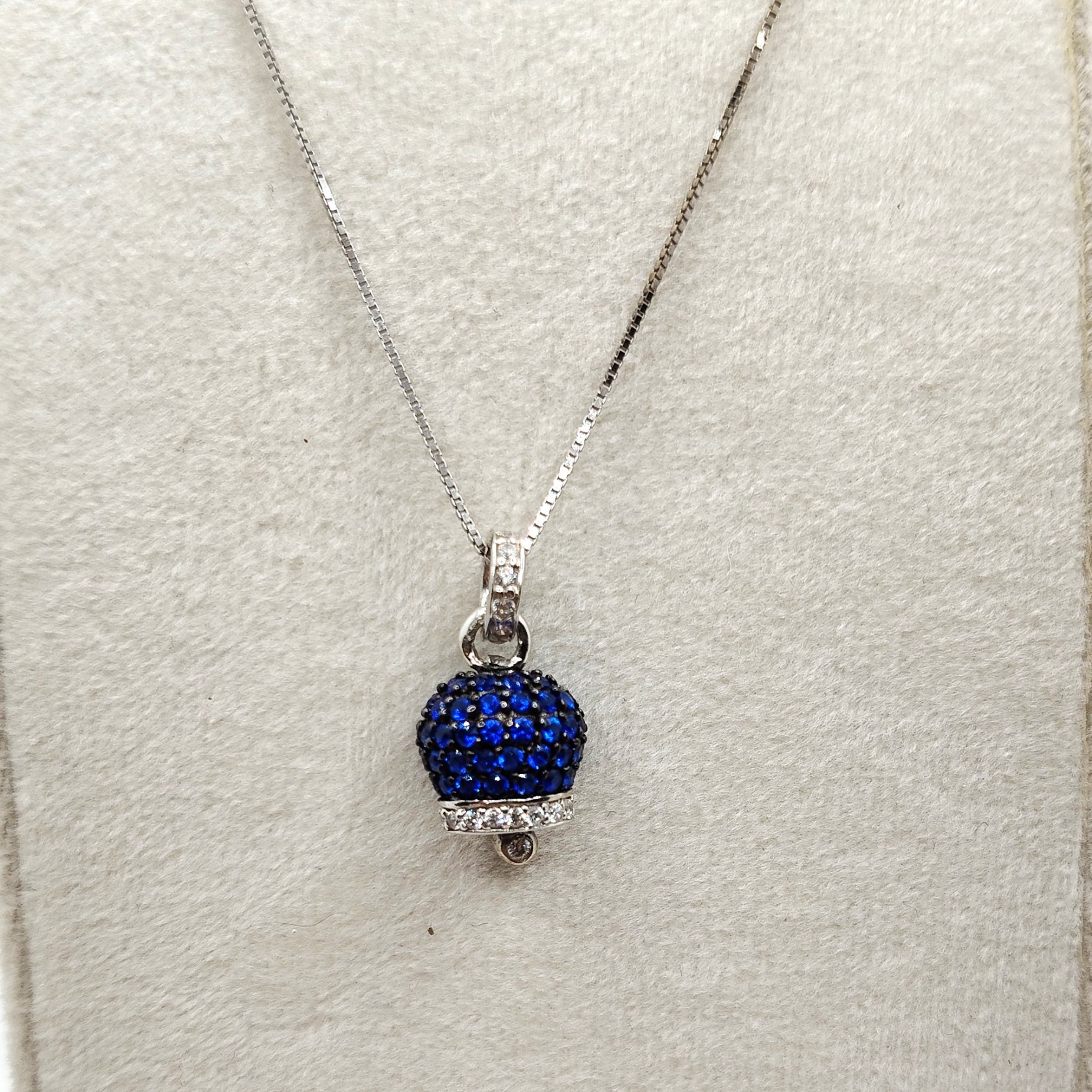 Collana con campanella modello capri in argento 925. Il centrale si presenta come una campanella in argento brunito intarsiata di zirconi fucsia tendente al violetto e bianchi o blu. La lunghezza della catenina varia a seconda della richiesta in genere è presenta una dalla lunghezza classica di 45 cm salvo diversa comunicazione in fase d’acquisto.