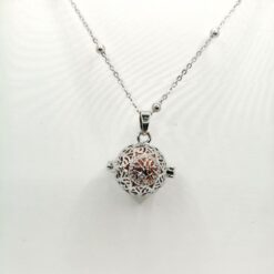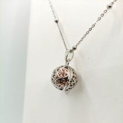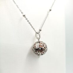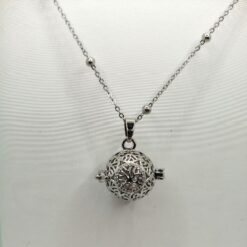 Collana chiama angeli con albero della vita in acciaio all’interno contiene un sonaglio che ad ogni movimento emette un suono. La collana è abbastanza lunga da arrivare sulla pancia. Il ciondolo può essere aperto, il sonaglio rimosso cosi la collana può essere riutilizzata senza sonaglio accorciando la catenina.