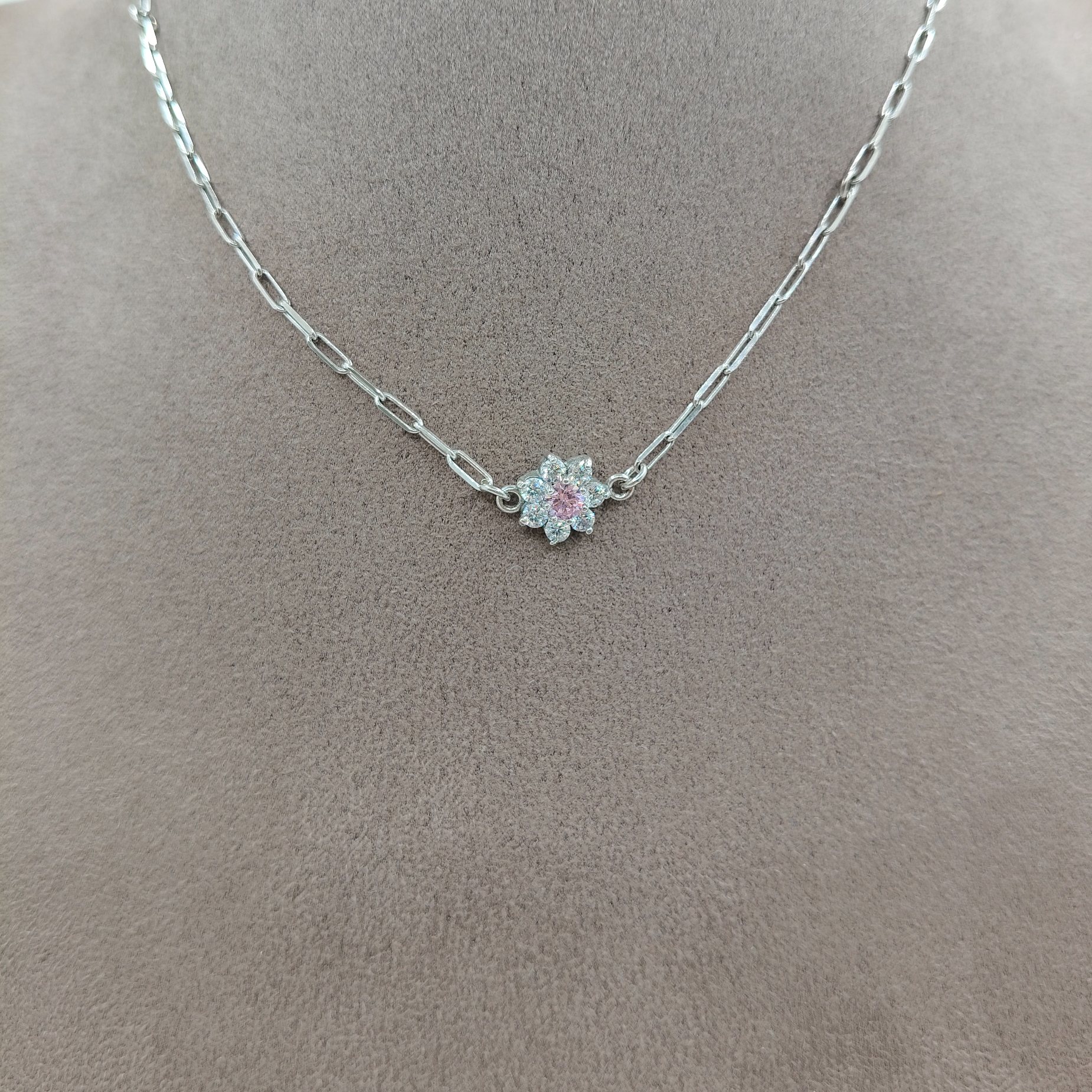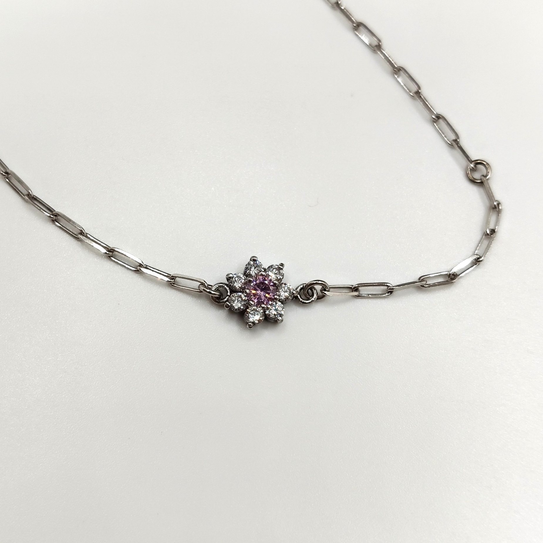 Collana fiorellino bicolore in argento 925 con zirconi bianchi e rora. la maglia della collana è rettangolare con chiusura a moschettone