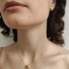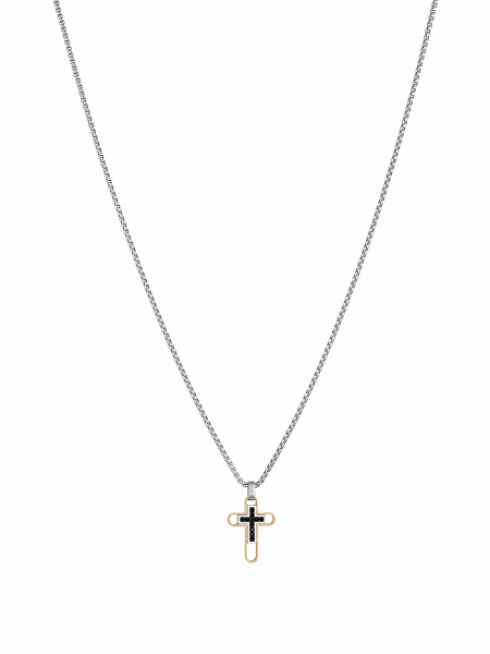 Collana in acciaio 316L con croce stilizzata tonda placcata oro rosa con all’interno una croce più piccola in acciaio con pietre nere.