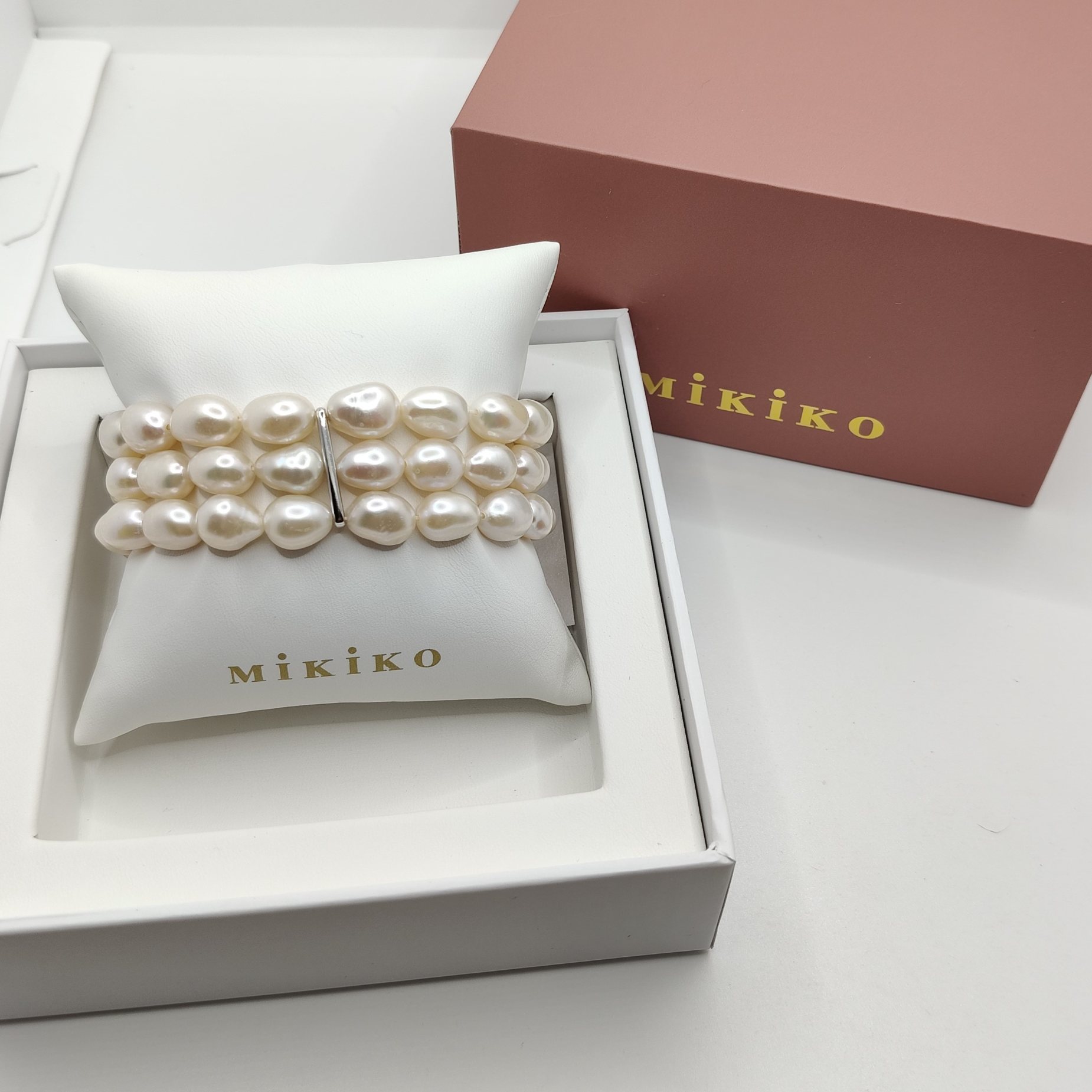 Mikiko bracciale a molla con 3 fili di perle barocche e una targa in argento che unisce in fili in molla