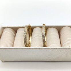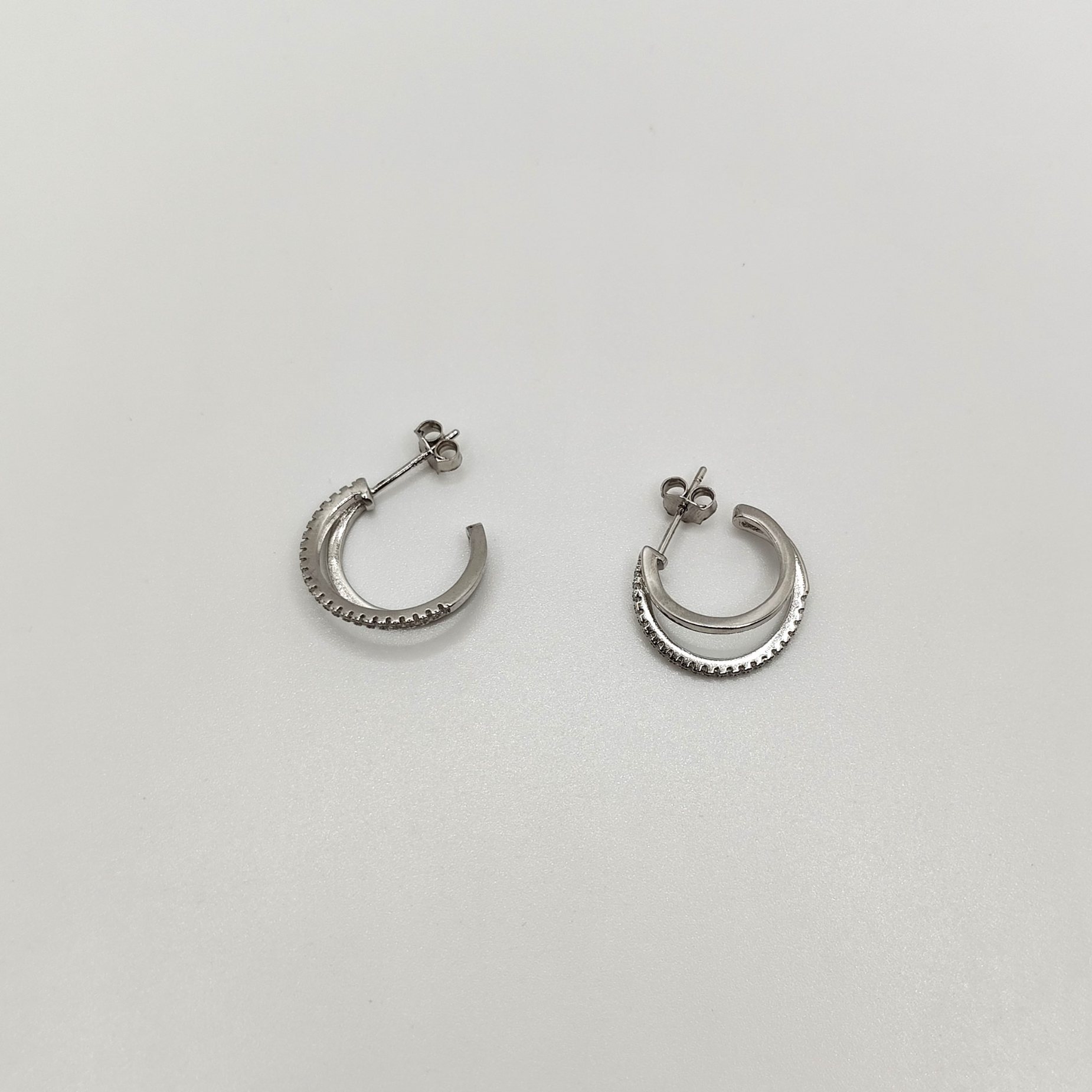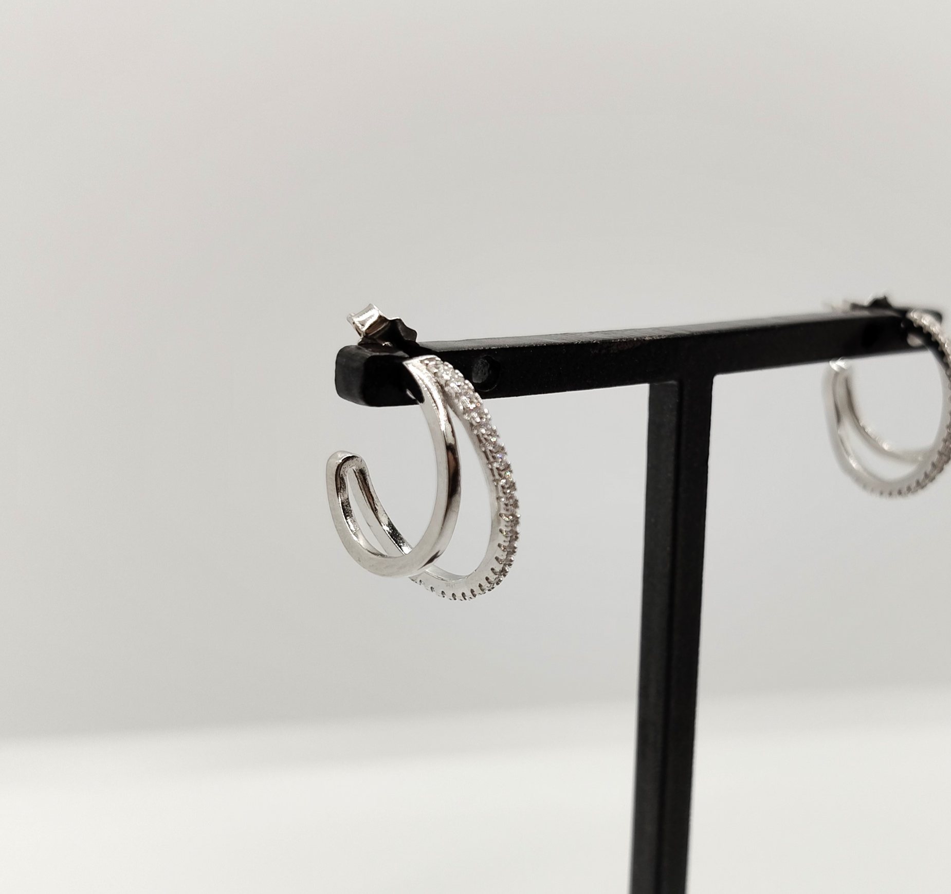 Orecchini a cerchio composti da 2 fili: uno liscio in argento, l’altro sempre in argento 925 ma con zirconi. I fili sono di diversa grandezza. Il doppio filo costituisce un solo orecchino.