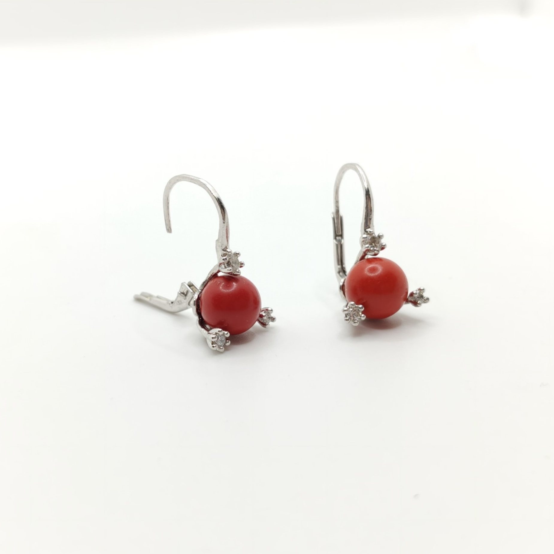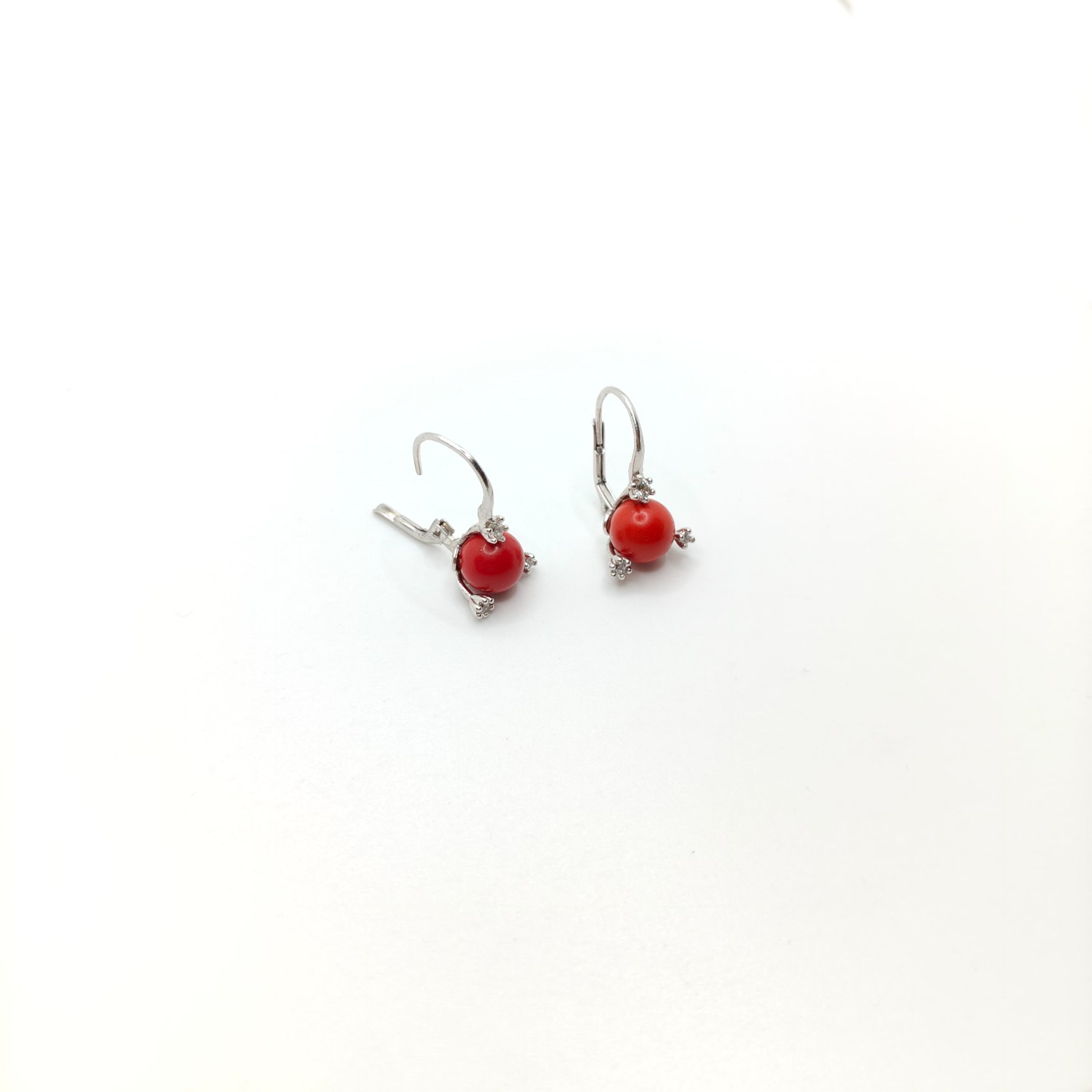 Orecchini in argento 925 con pietra color corallo tondo e zirconi bianchi al lato con chiusura a monachella