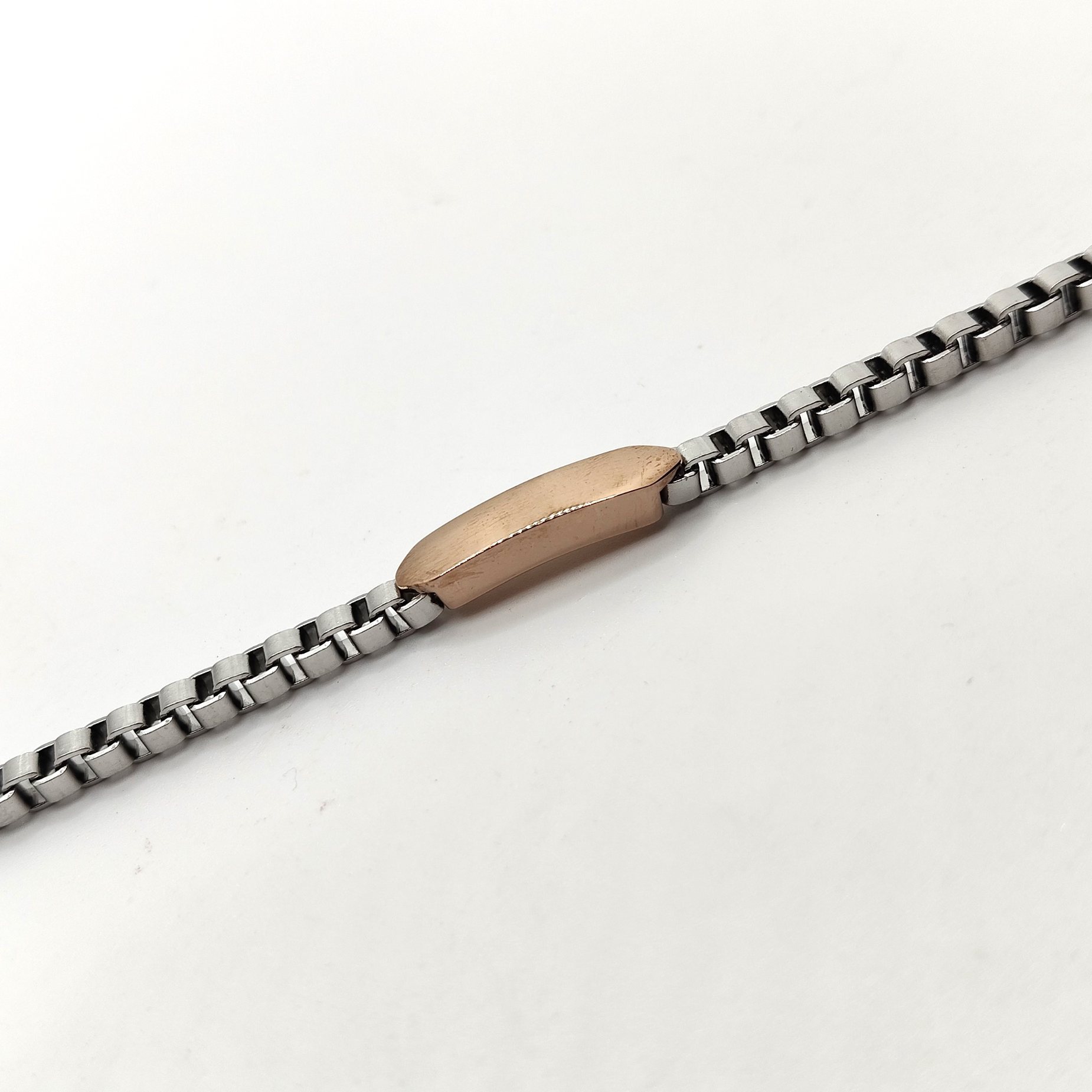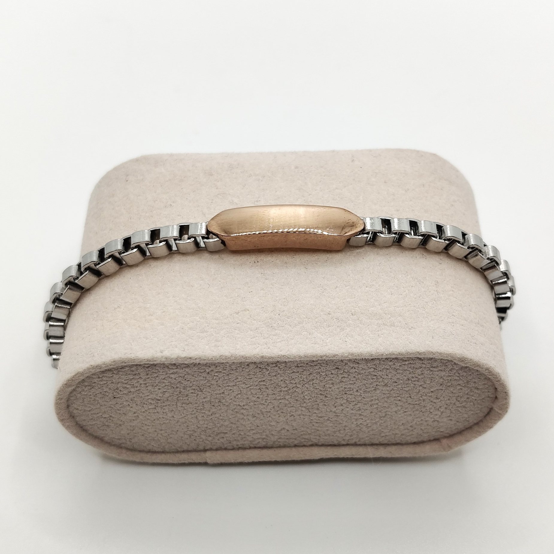 Bracciale da uomo in acciaio e acciaio placcato oro rosa con cinturino in acciaio maglia cubica. La lunghezza è variabile grazie alla prolunga facilmente regolabile.