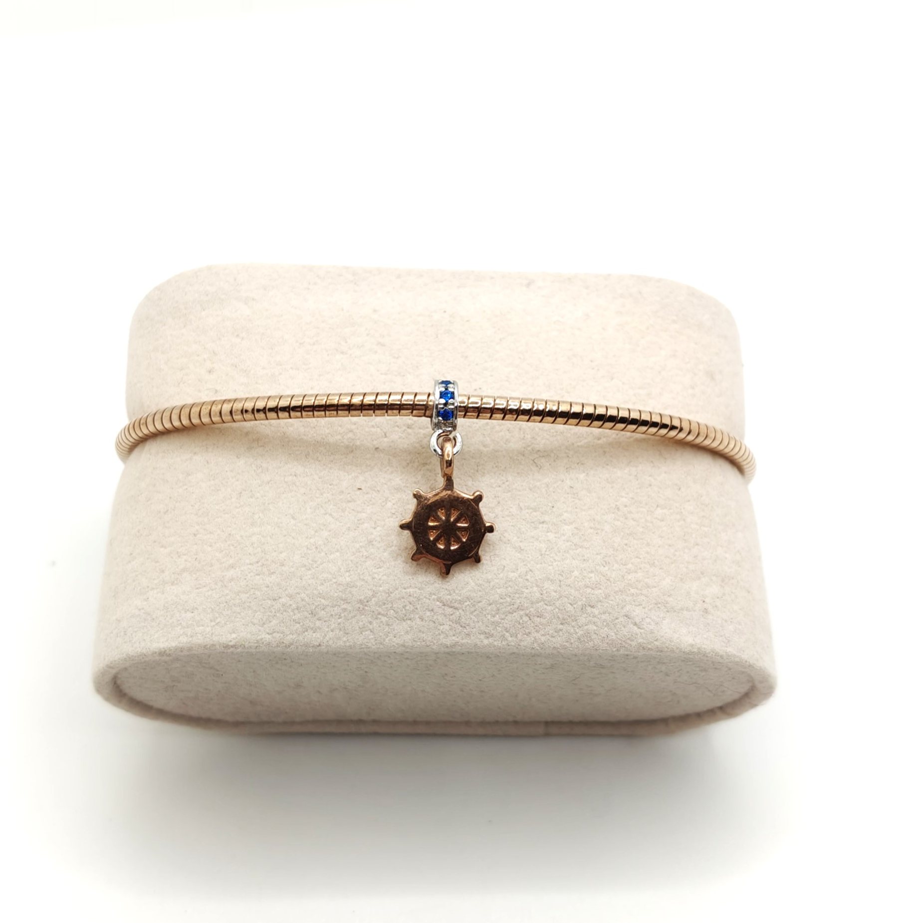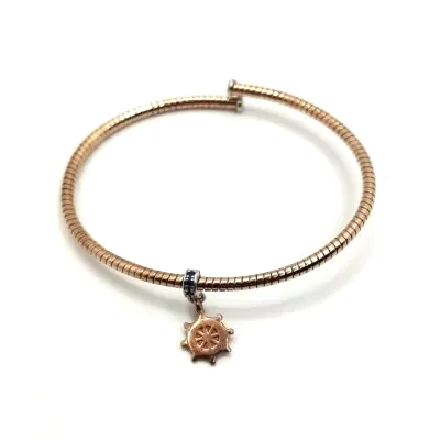 Bracciale da uomo rigido con timone e zirconi blu in argento 925 placcato oro rosa (eccetto il gancetto del timone in argento con zirconi blu)
