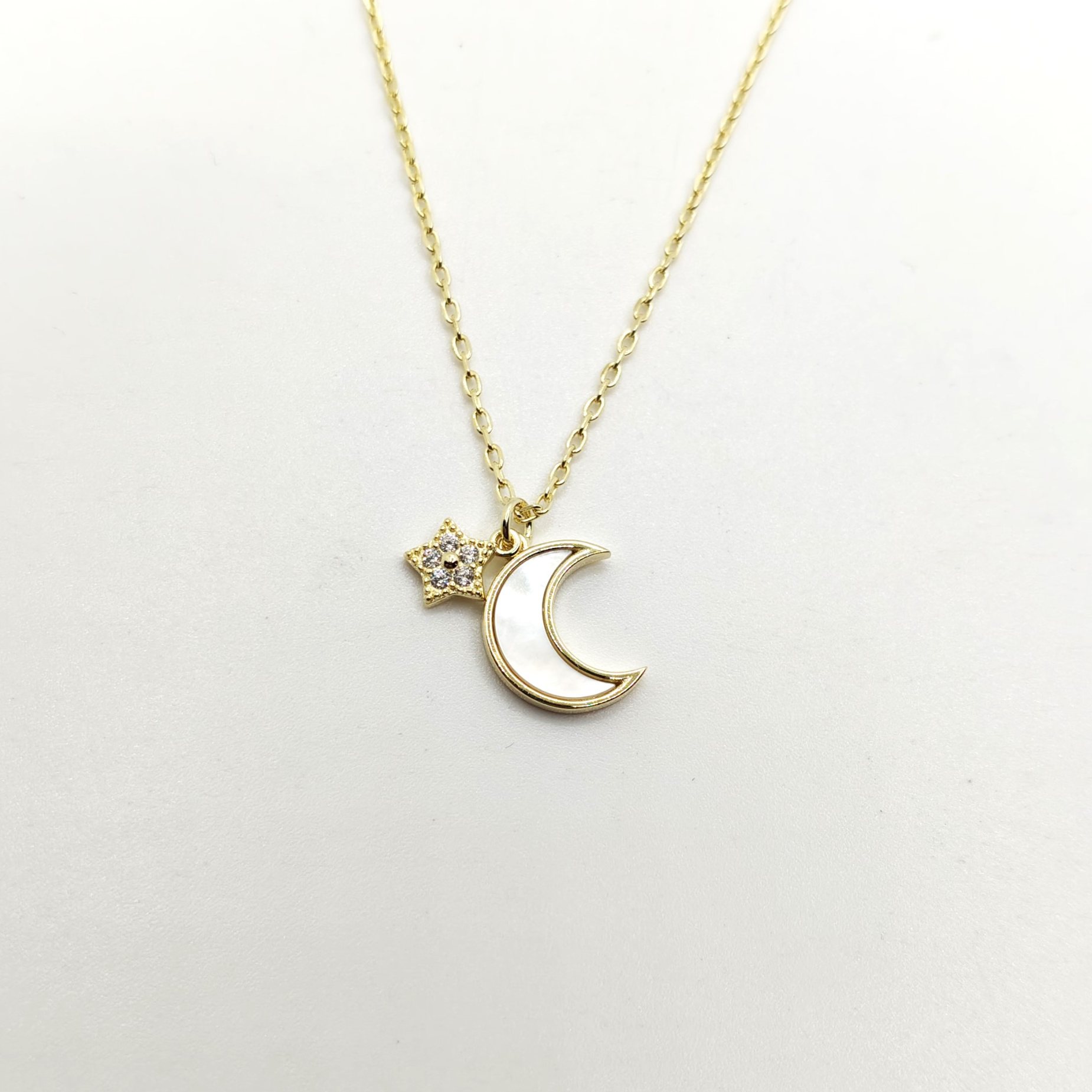 Collana in argento 925 placcato oro giallo con luna in madreperla e stellina con zirconi e chiusura a moschettone