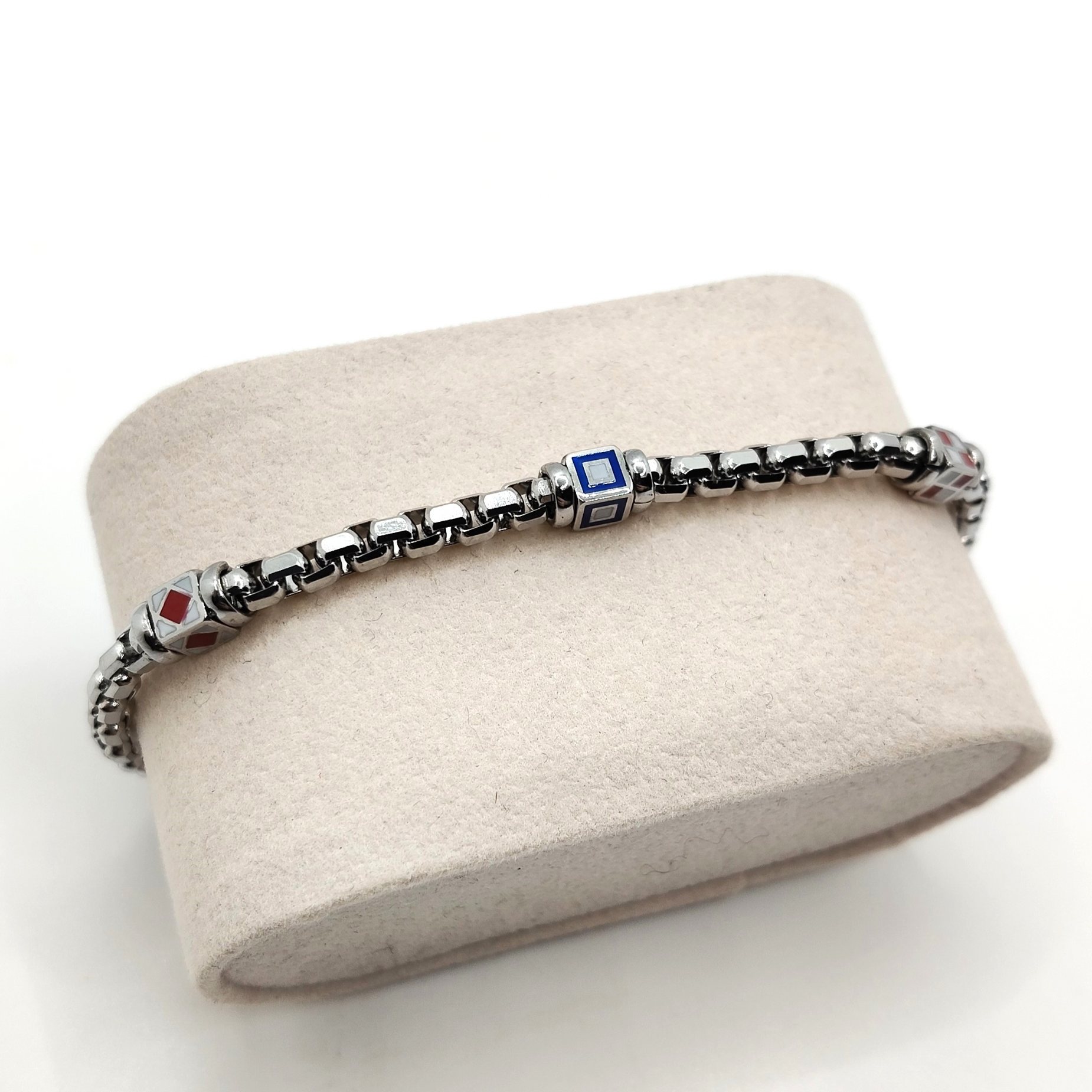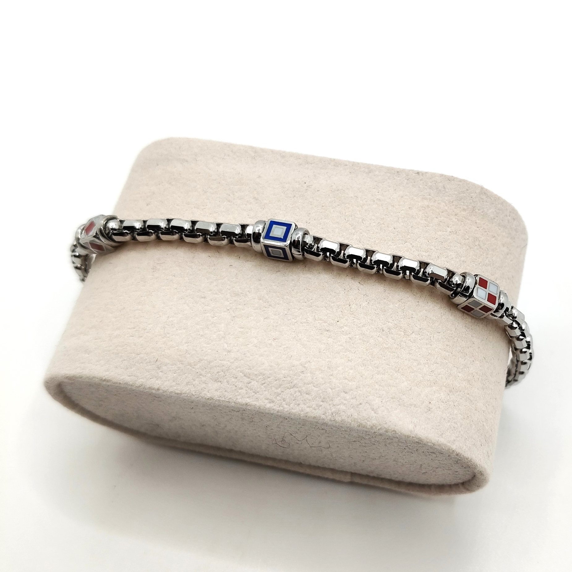 Bracciale da uomo in acciaio cinturino in acciaio con maglia cubica e riferimenti alle bandiere nautiche smaltate su 3 cubi