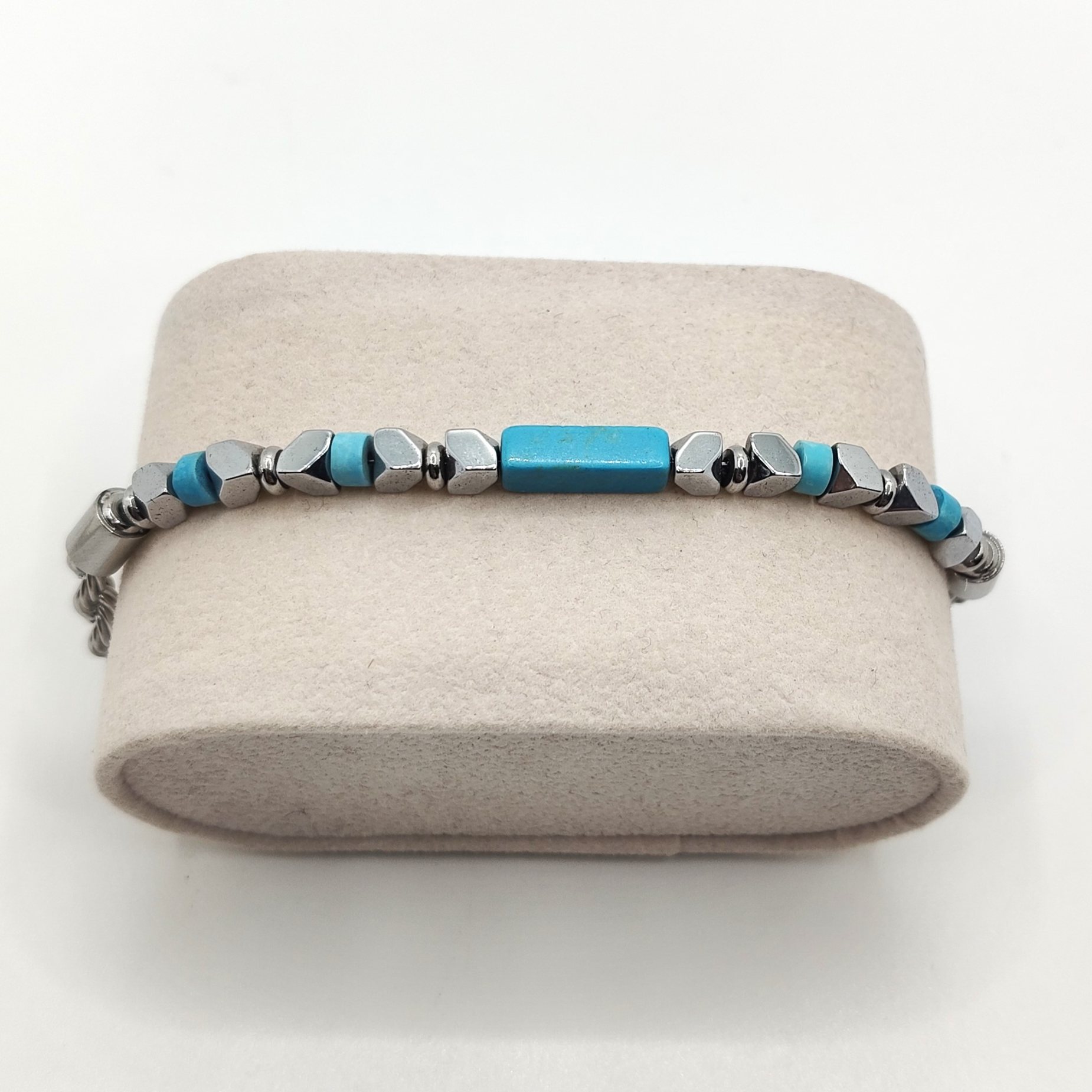 Bracciale da uomo con pepite squadrate in acciaio catena maglia intrecciata e pietre turchesi. La lunghezza è variabile grazie alla prolunga facilmente regolabile.