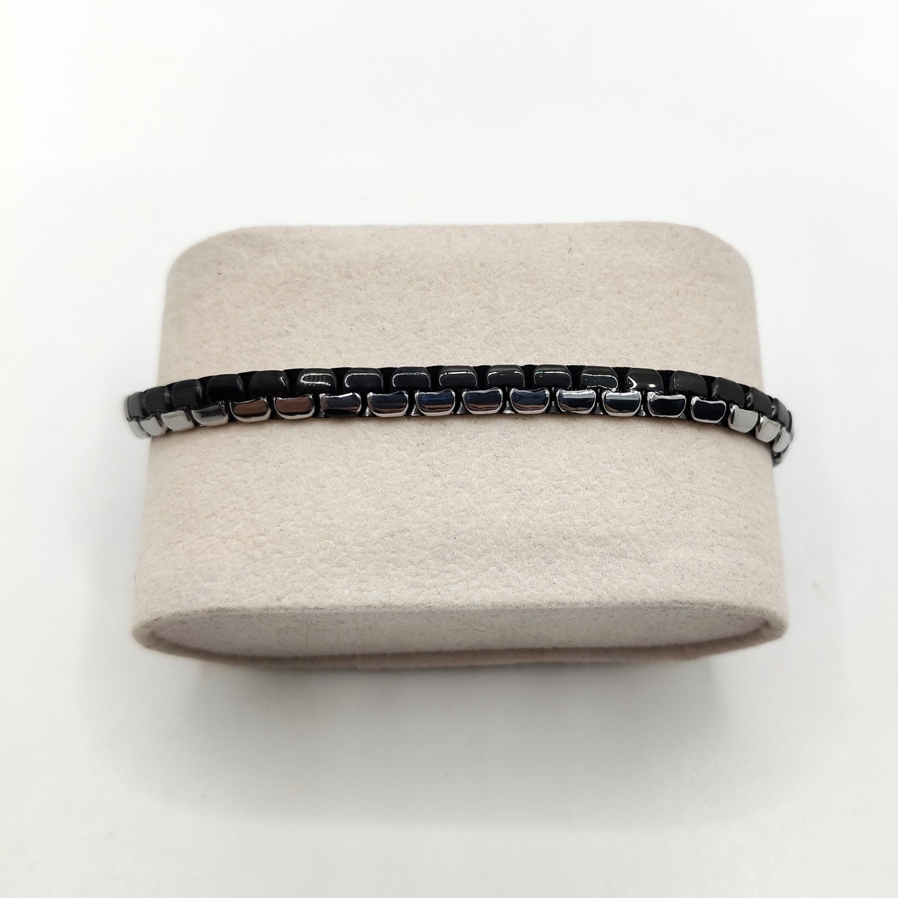 Bracciale da uomo in acciaio e acciaio smaltato nero dalla maglia quadrata schiacciata. La lunghezza è variabile grazie alla prolunga facilmente regolabile.
