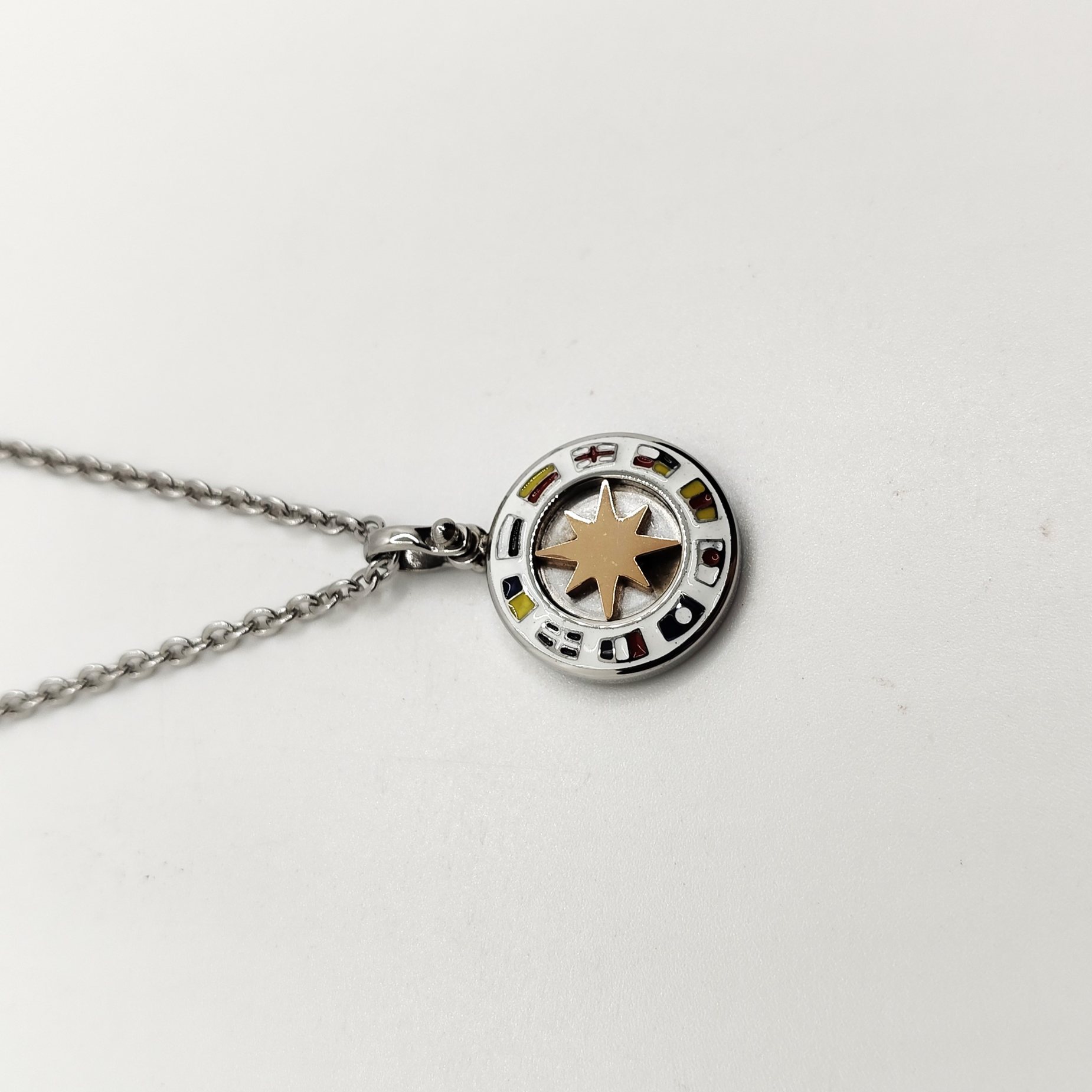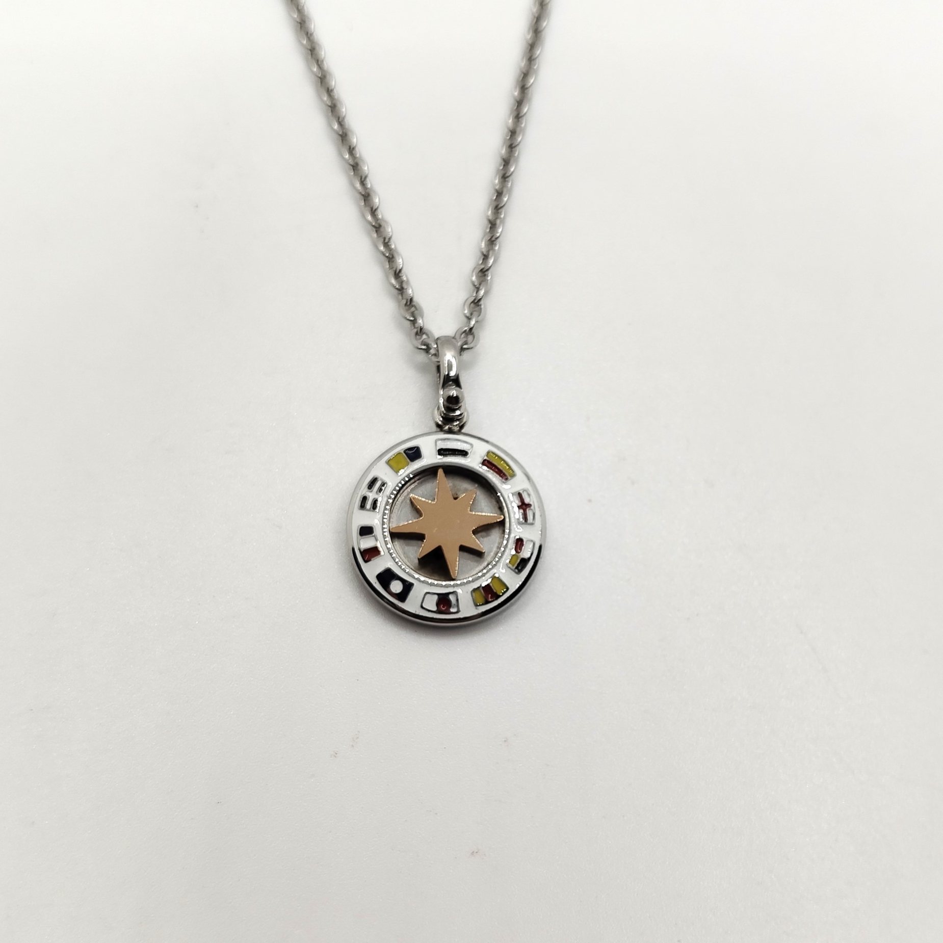 Collana da uomo in acciaio con rosa dei venti centrale placcata oro rosa su una base bianca con bandiere delle repubbliche marinare al lato. Lunghezza regolabile tramite prolunga.